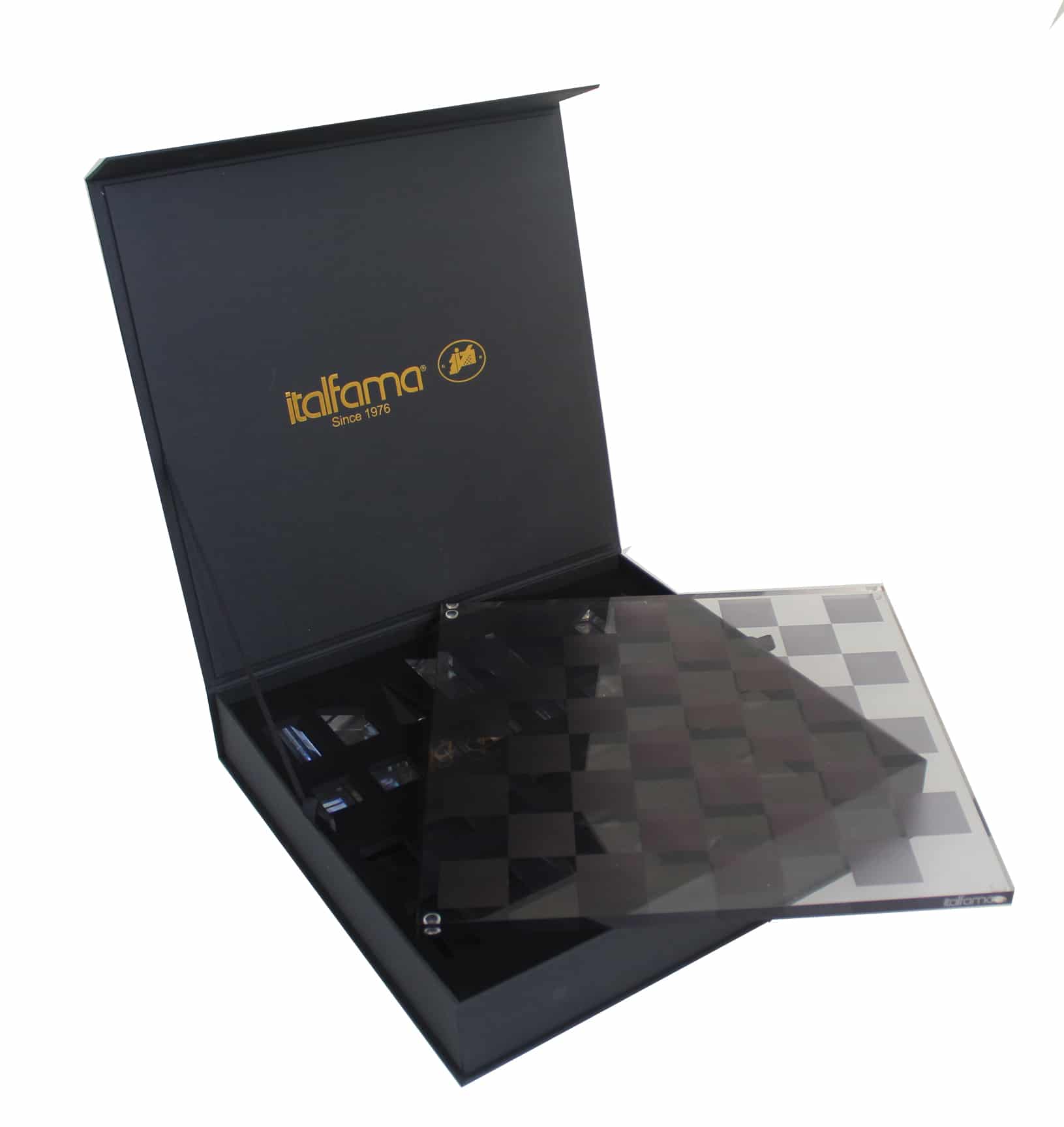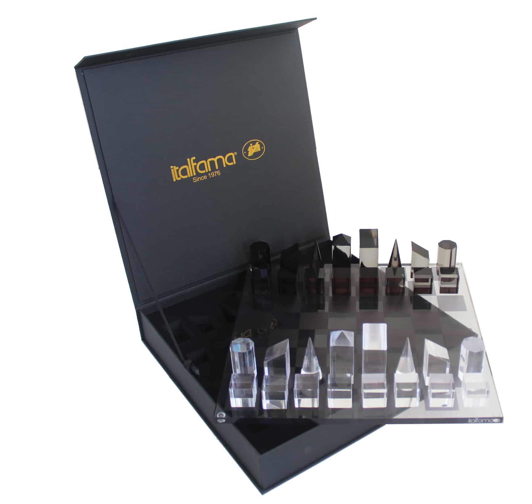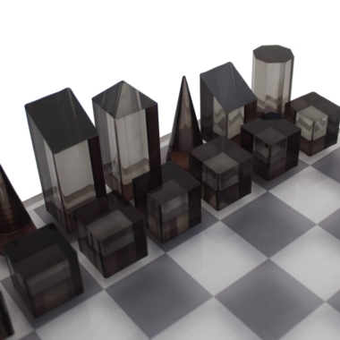 Juego de Ajedrez Diseño Cubo Gris y Translúcido Brillante en Plexiglás con Estuche de Almacenamiento