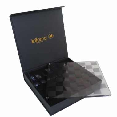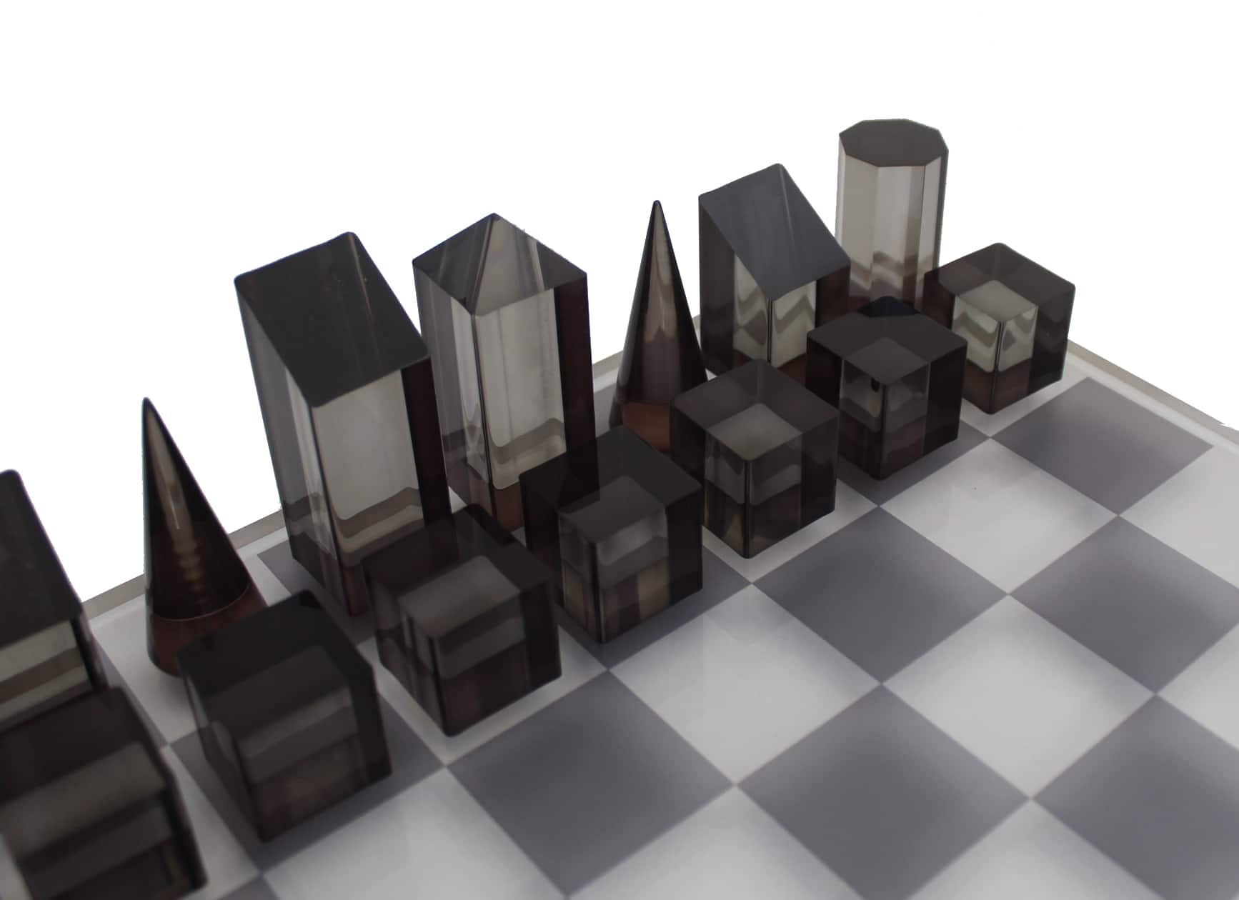 Las piezas de ajedrez son grises y translúcidas con un acabado brillante y tienen una altura de rey de 6,5 cm.