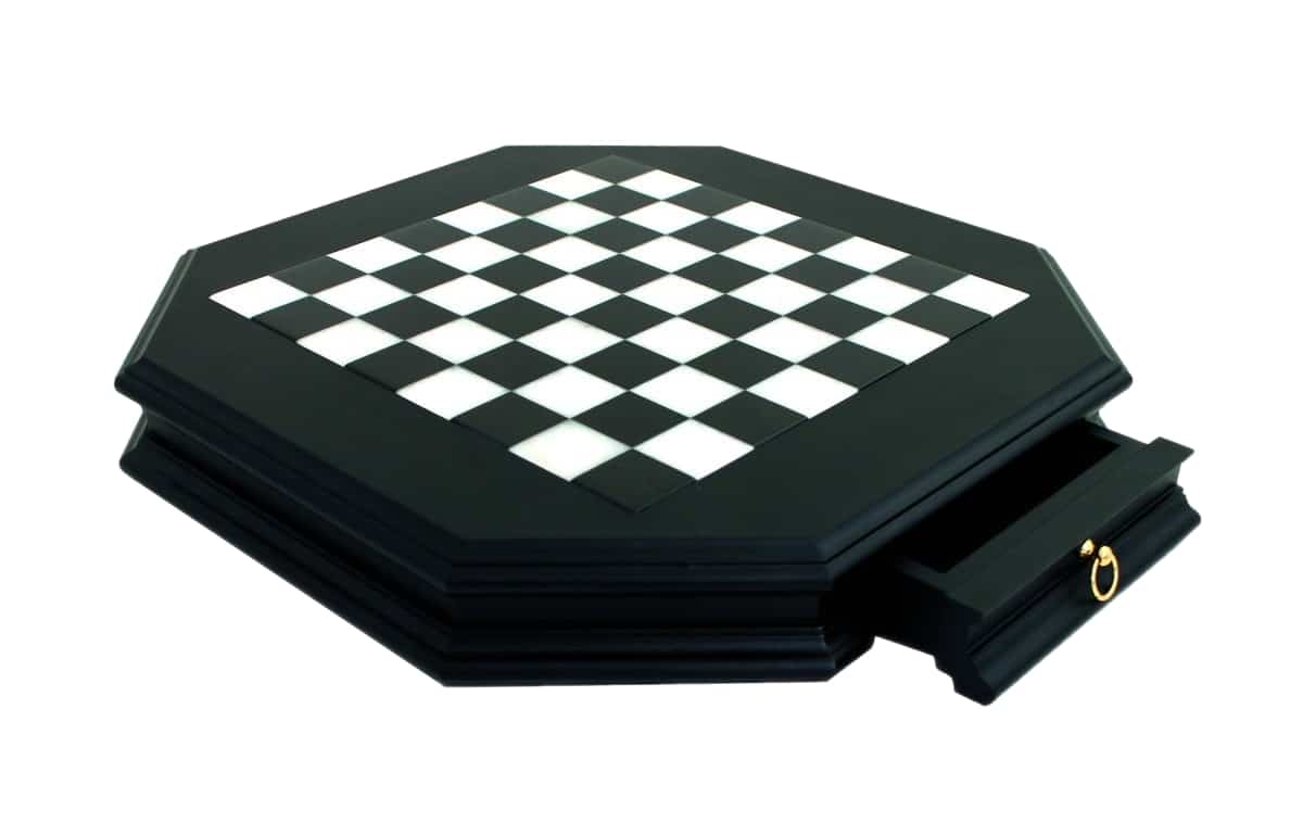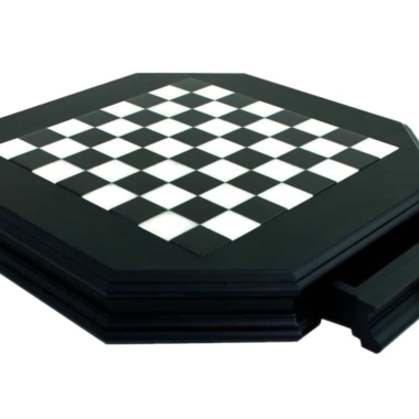 Vienen acompañadas de un espectacular tablero de ajedrez de forma octogonal en madera lacada negra y de una superficie en mármol negro y blanco. El tablero incluye un cajón de almacenamiento para guardar todo el set de piezas de ajedrez. Sus dimensiones son de 47 x 47 x 7 cm.
