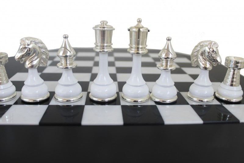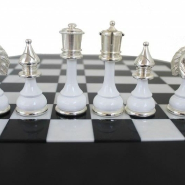 Las piezas del juego de ajedrez negras y blancas están fabricadas a mano en latón macizo y madera. Han recibido en la parte de latón un chapado en oro y plata. Tienen una altura de rey de 9 cm.