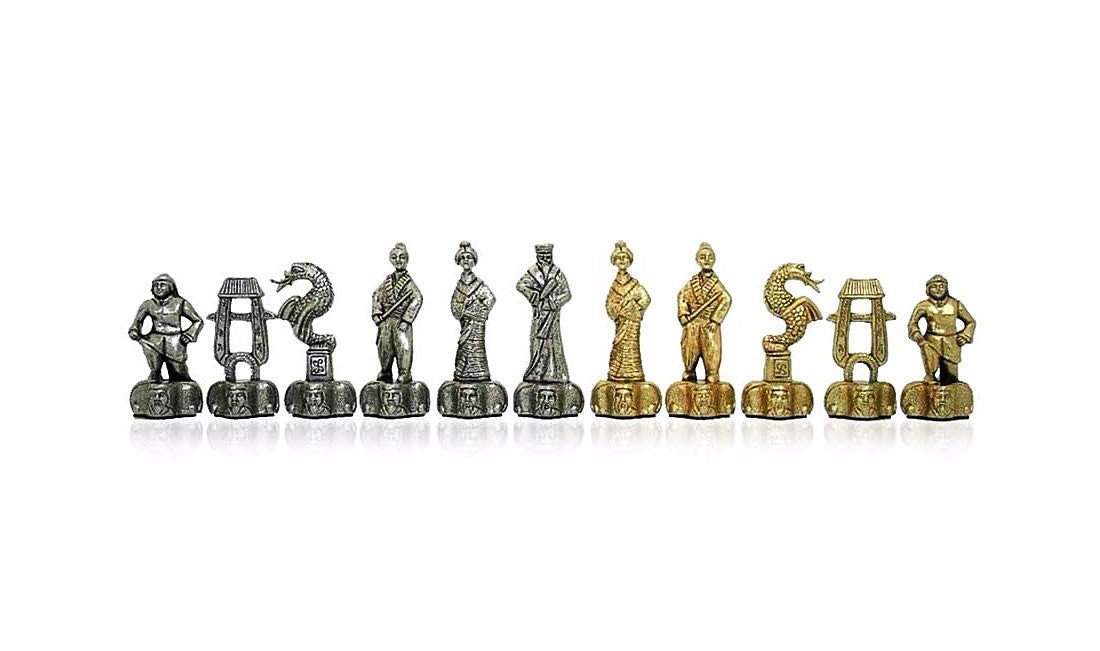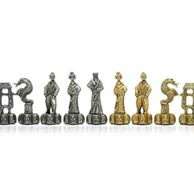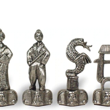 Elegantes figuras en metal que representan a los samuráis con un acabado en color oro y plata. Cada pieza del juego representa un elemento fuerte de su cultura.