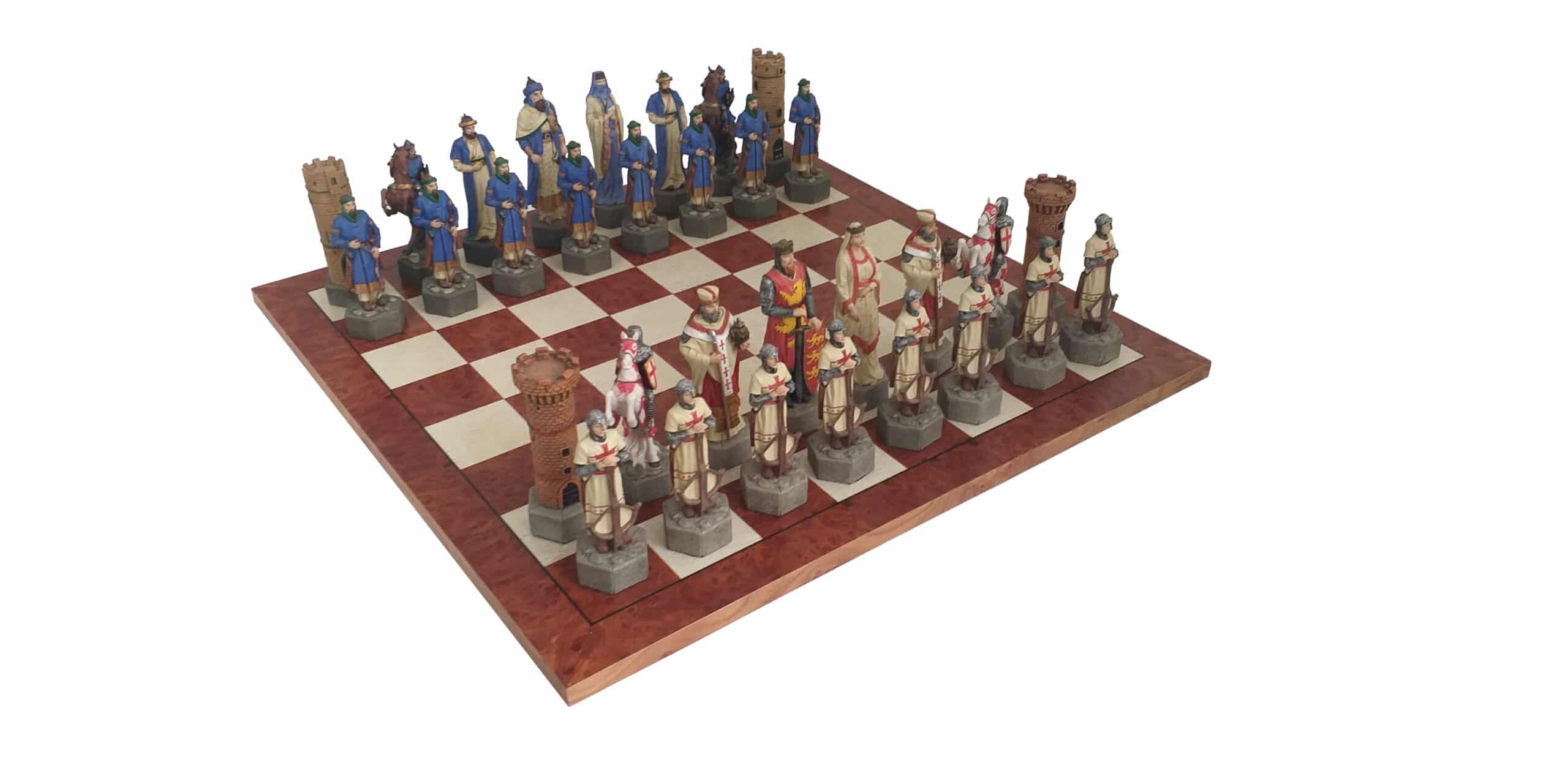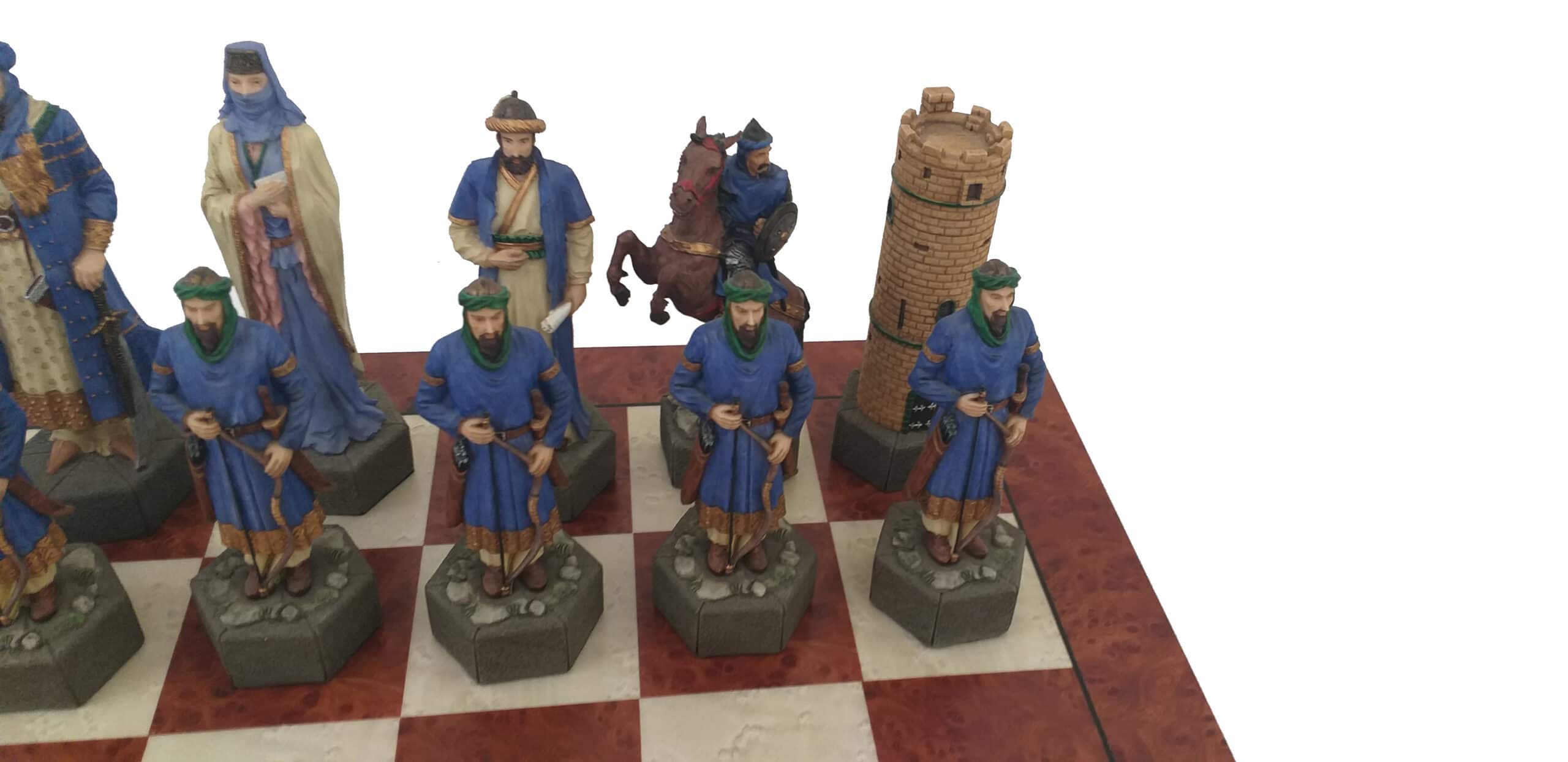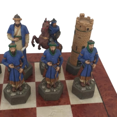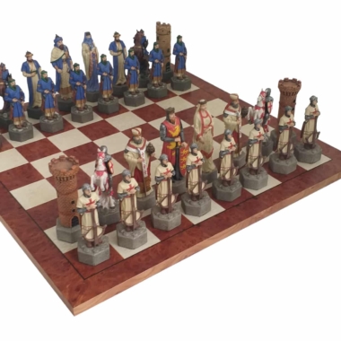 Un conjunto de juego de ajedrez de gran tamaño realizado con el tema de las cruzadas y con materiales de bella calidad.