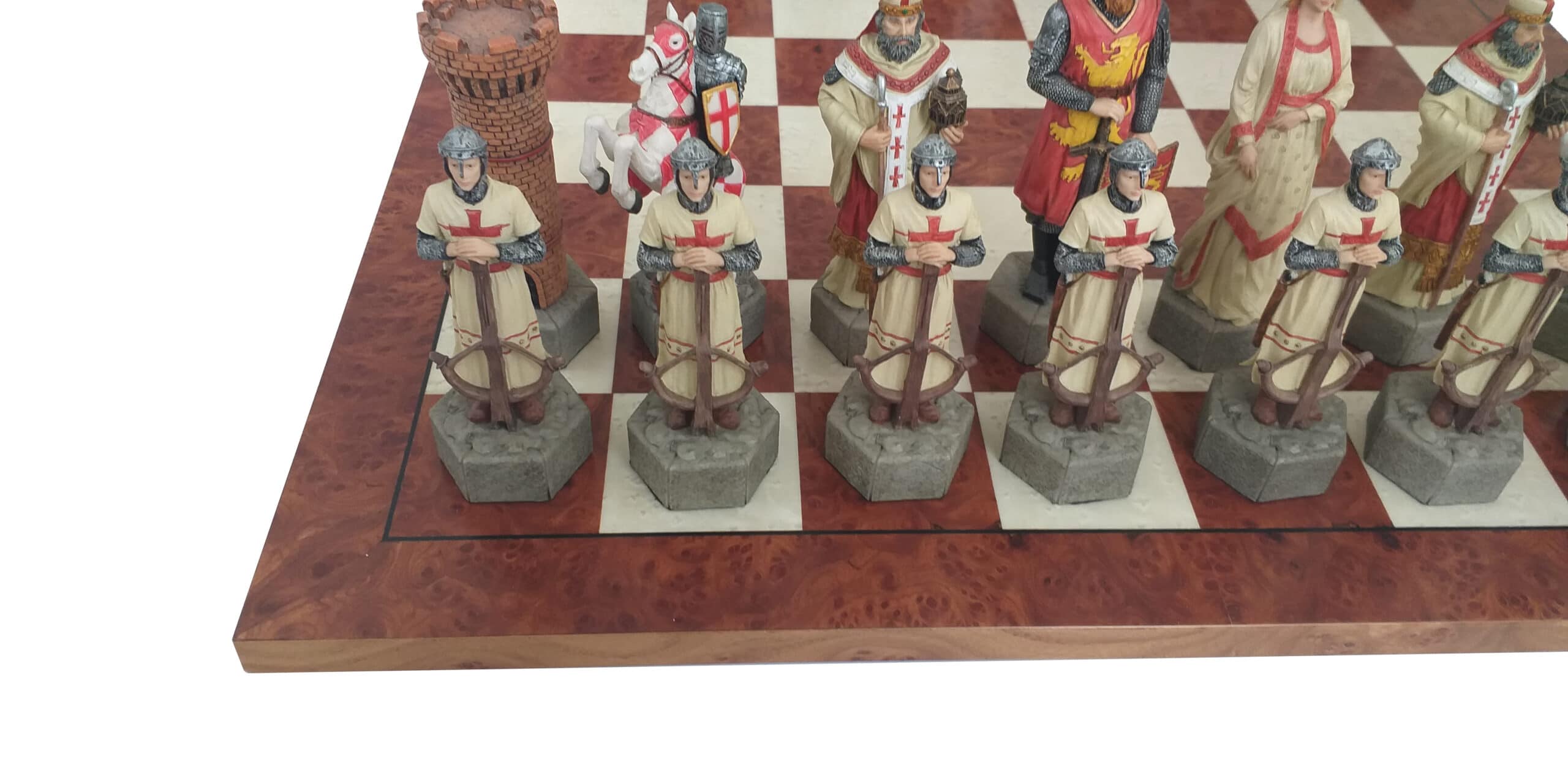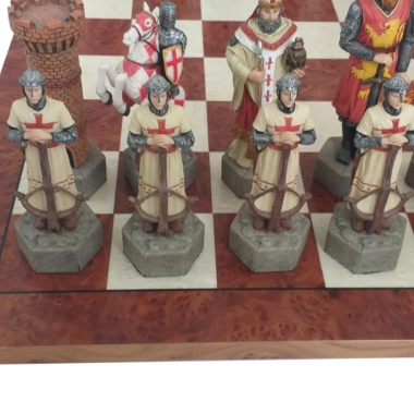 El set de piezas de ajedrez en resina está inspirado en las Cruzadas. Con una altura de rey muy grande de 17 cm, cuentan con numerosos detalles, están completamente pintadas a mano.