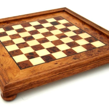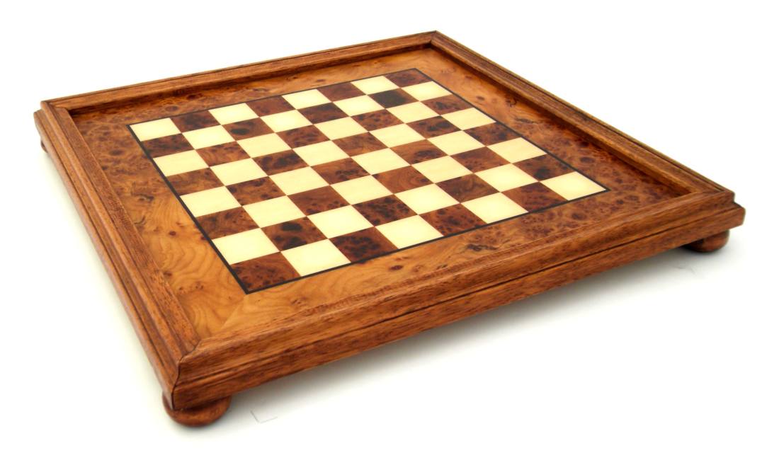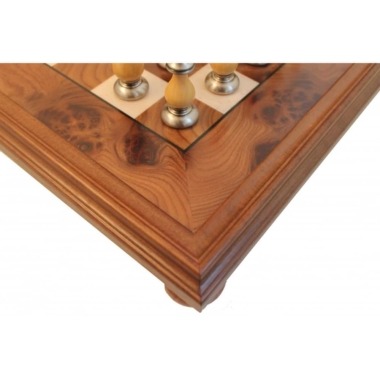 El magnífico tablero de ajedrez elevado, de una dimensión de 56 x 56 cm, está fabricado en madera de Brezo y Madera de Olmo.