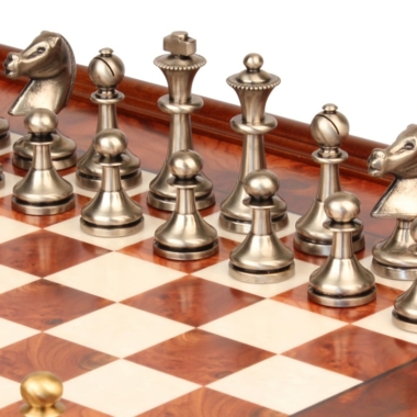 Un conjunto de juego de ajedrez de gran tamaño con un tablero de 53 x 53 cm de estilo Staunton tradicional que combina metal y madera. Una muy bella realización de nuestro artesano italiano.