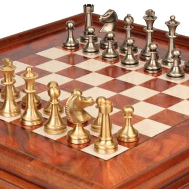 Juego de Ajedrez Gran Staunton – Tablero de Madera de Brezo y Madera de Olmo con Cajón y Piezas de Latón Macizo