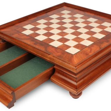 El tablero de ajedrez está elevado sobre sus 4 pies torneados, realizado en madera de Olmo y madera de Brezo e integrando un cajón para guardar las piezas de ajedrez.