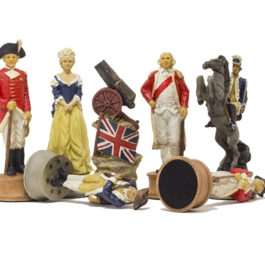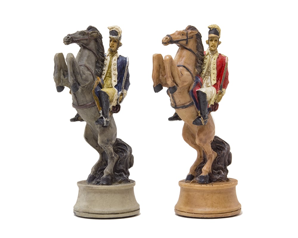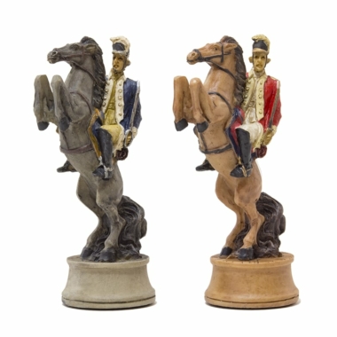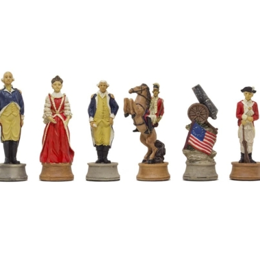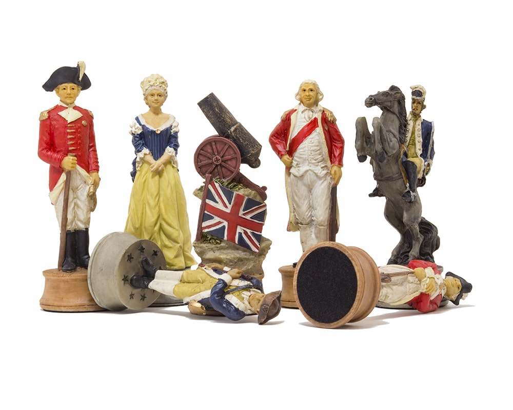 Las figuritas del juego de ajedrez en resina están inspiradas en la Guerra de Independencia de los Estados Unidos. Con una altura de rey de 8 cm están completamente pintadas a mano.