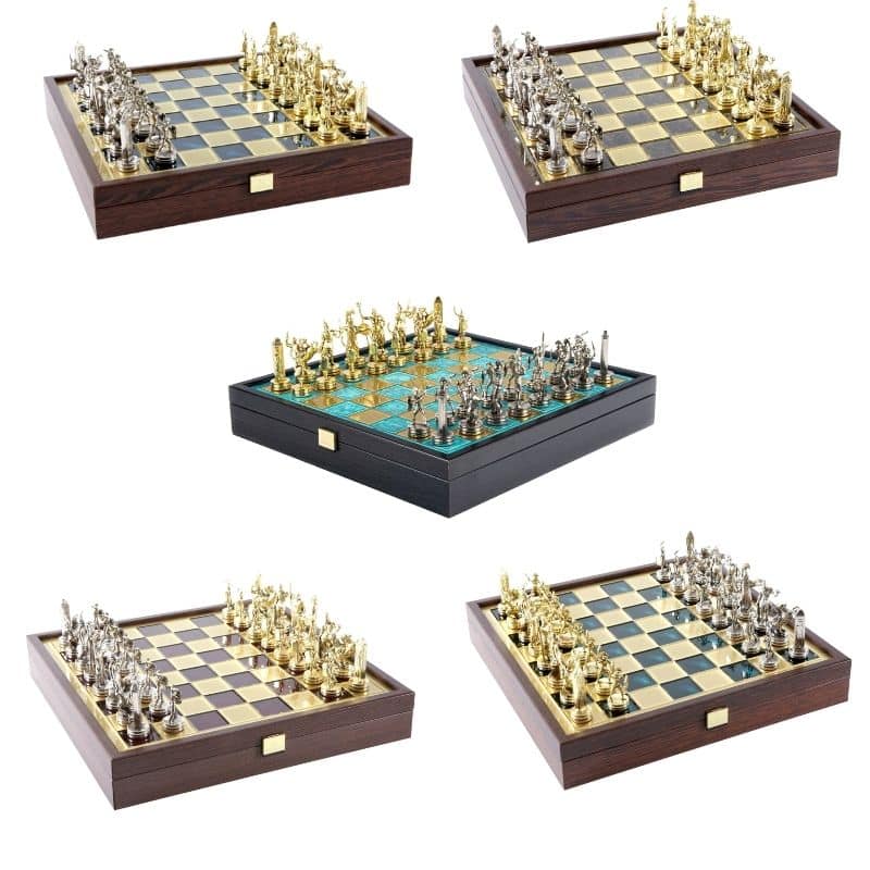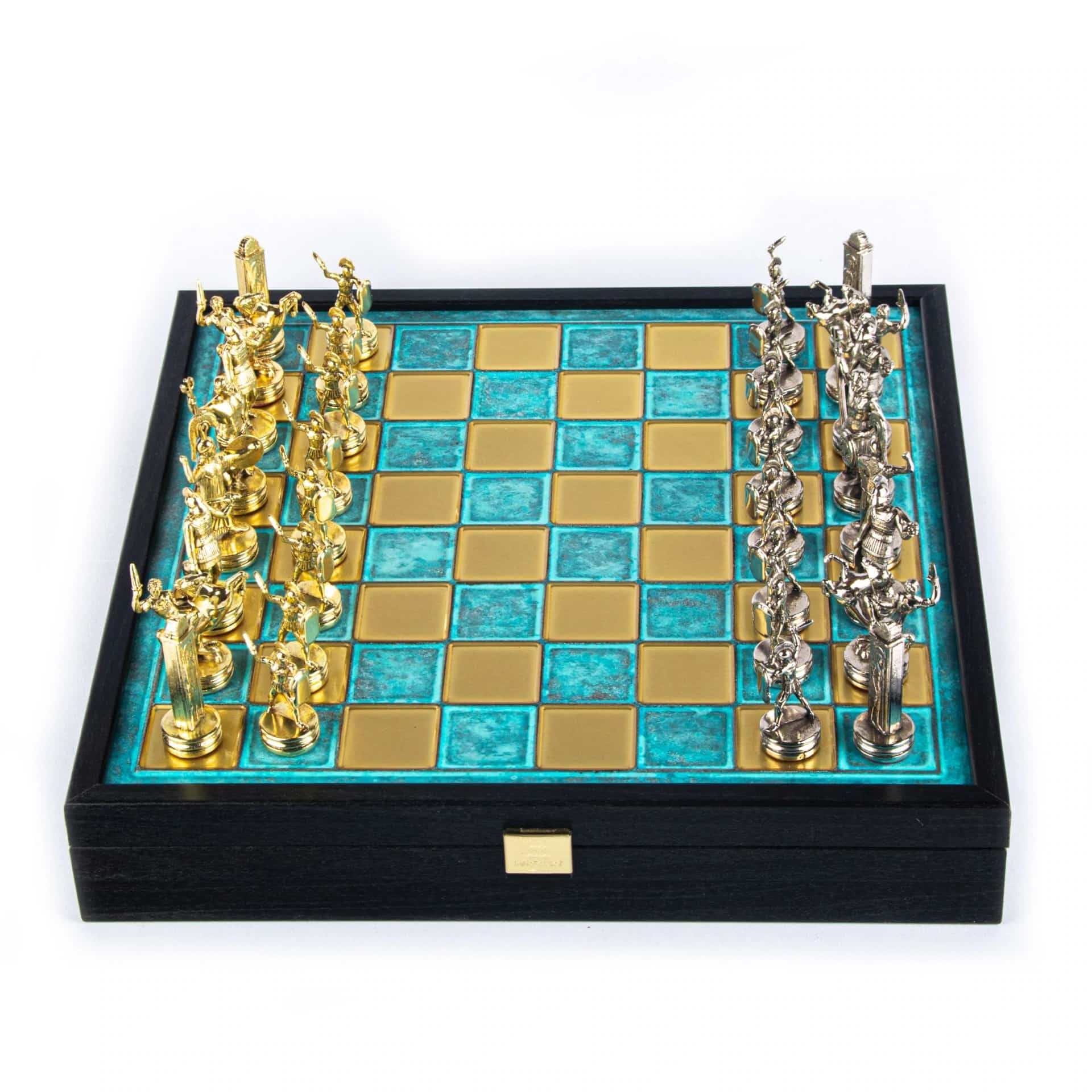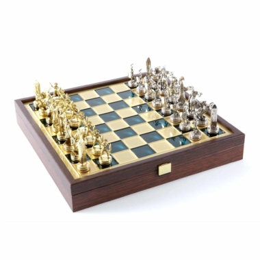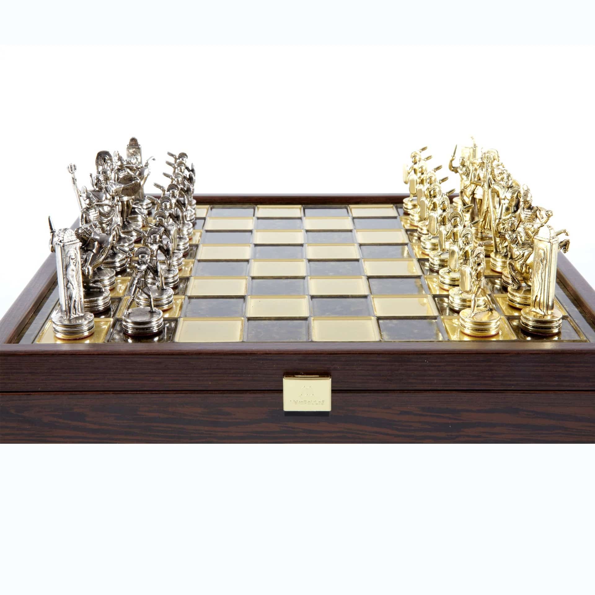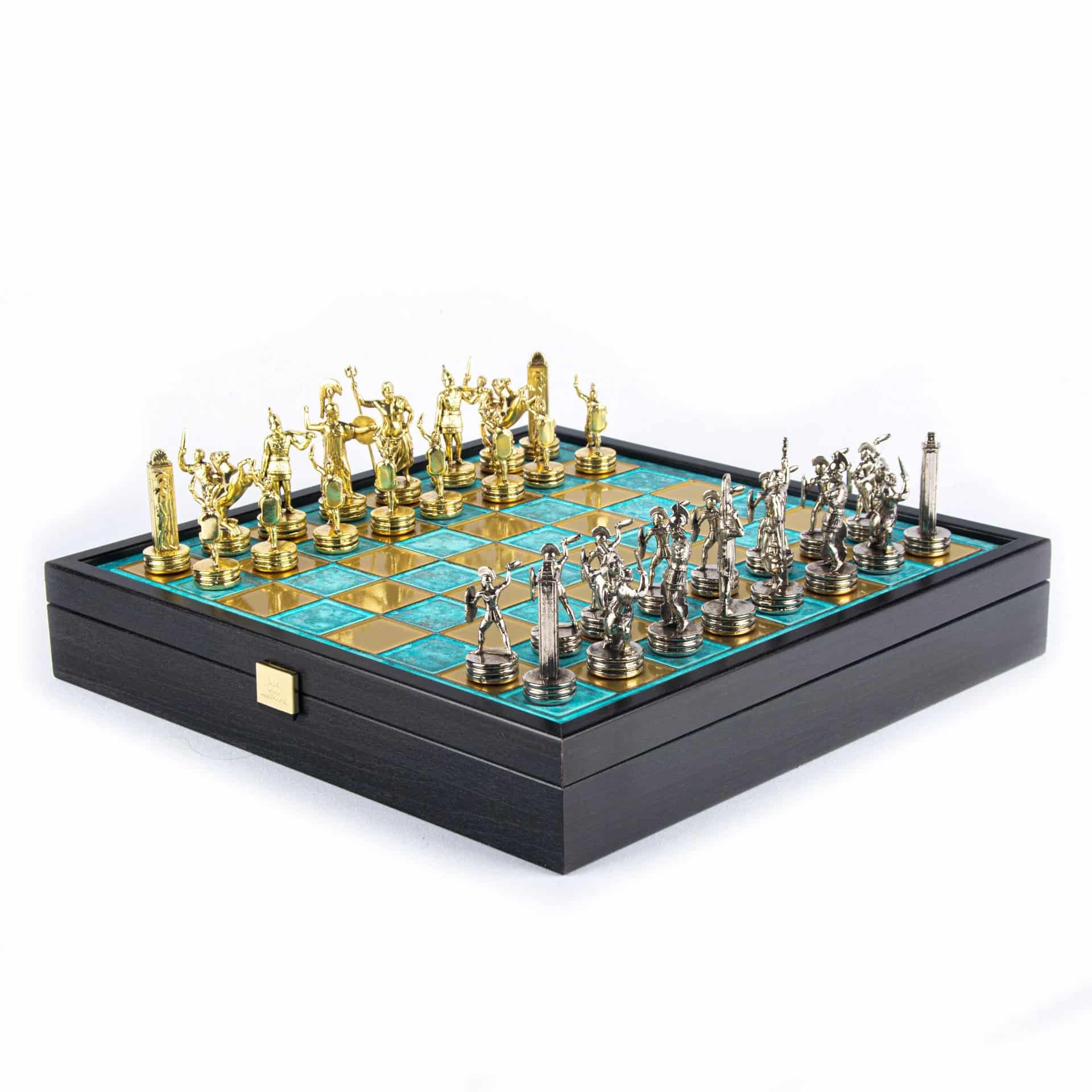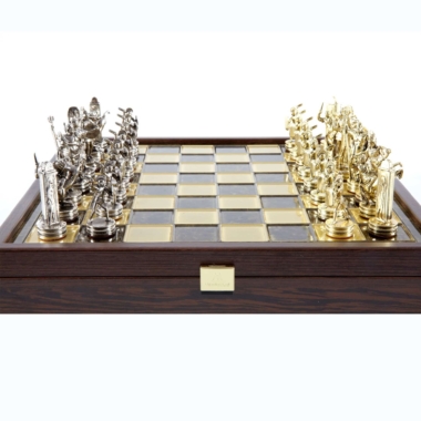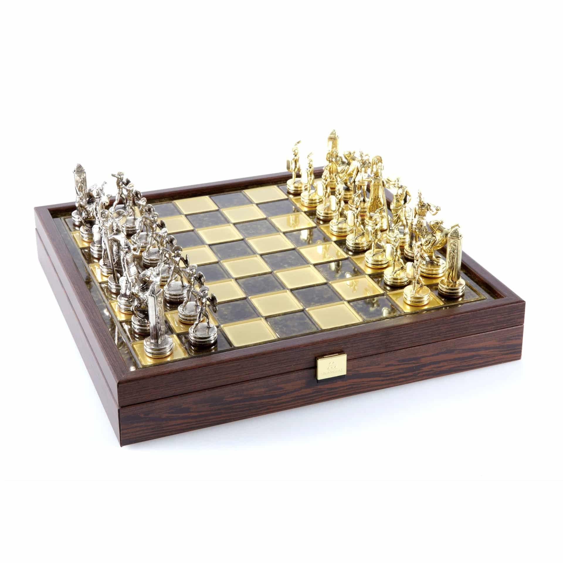 Juego de Ajedrez Mitología Griega en Metal Dorado y Plateado – Tablero con Almacenamiento Integrado