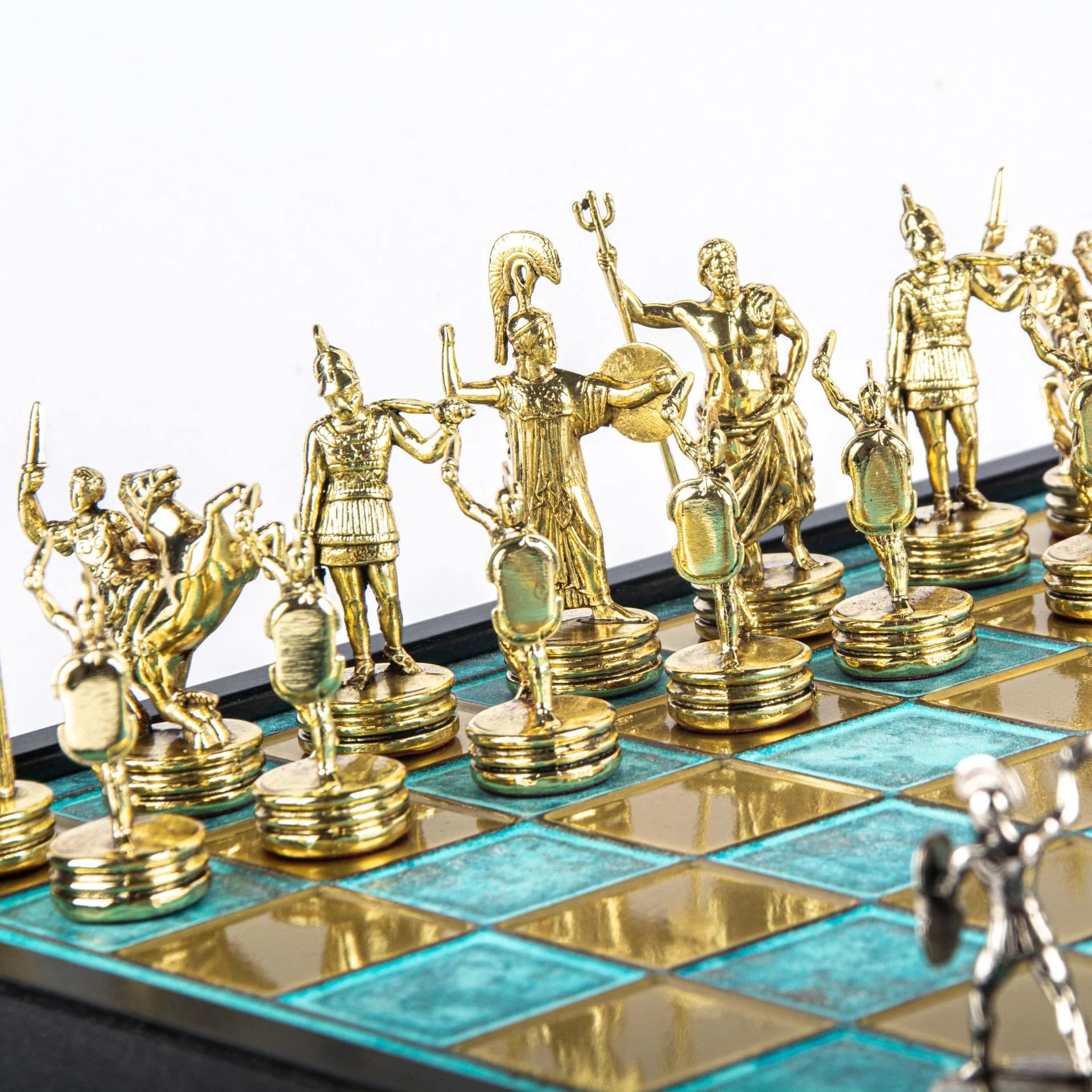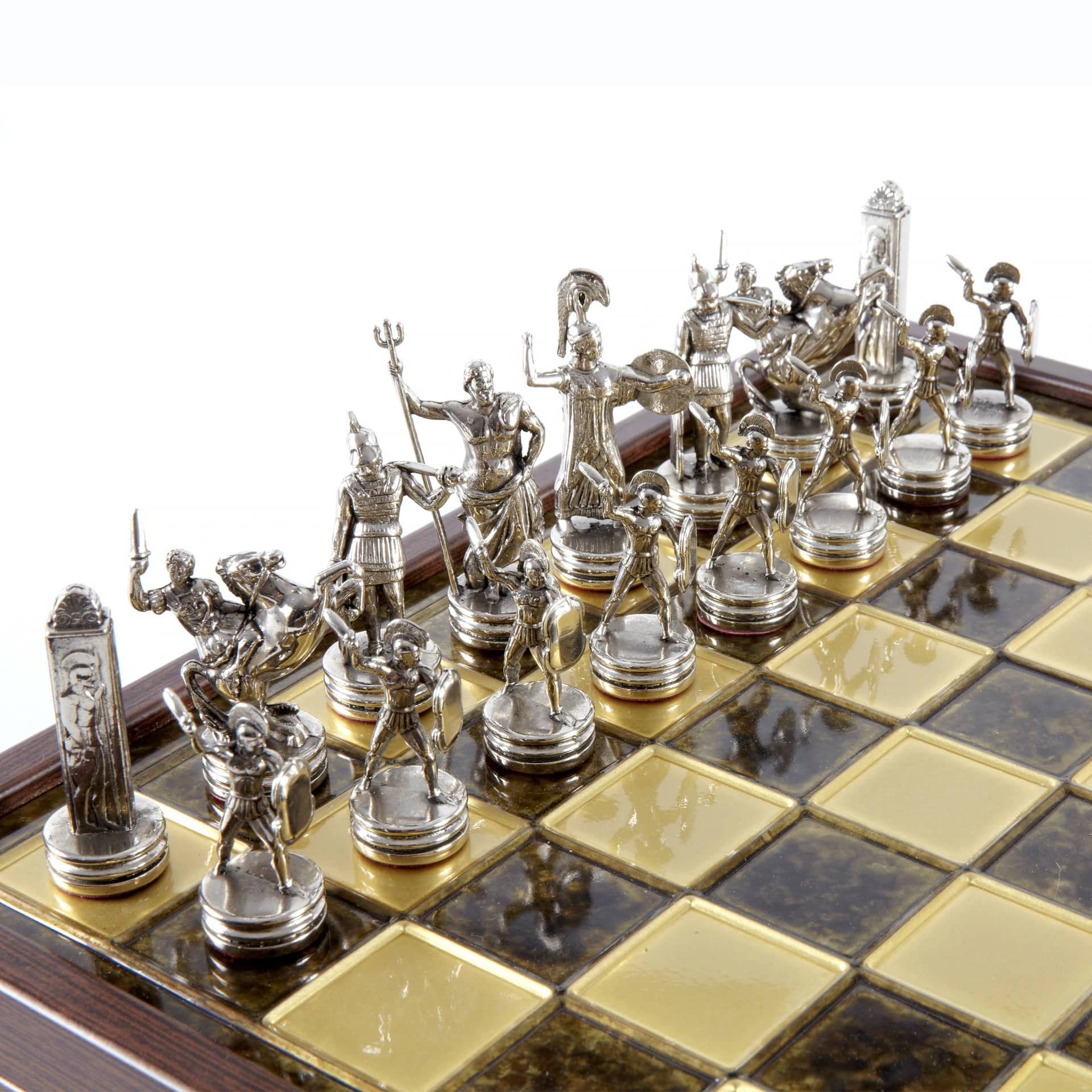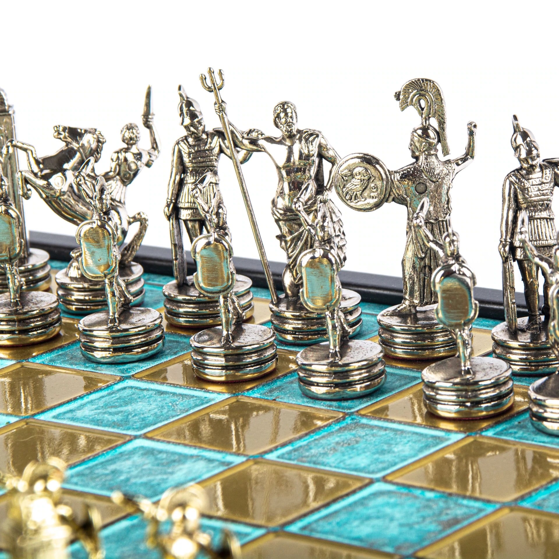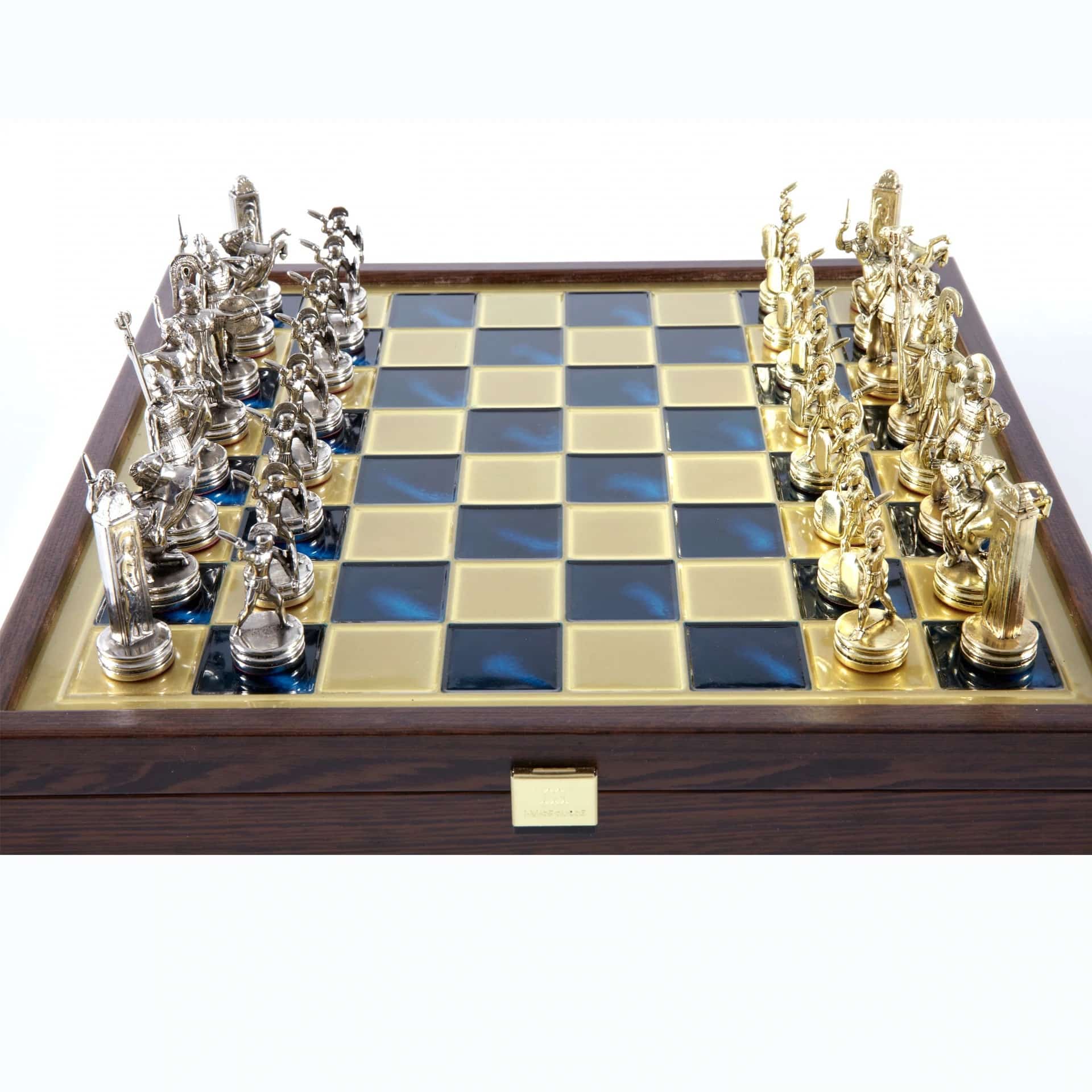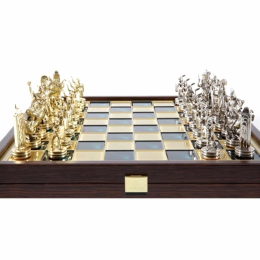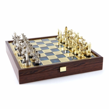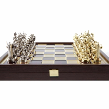 Juego de Ajedrez Mitología Griega en Metal Dorado y Plateado – Tablero con Almacenamiento Integrado