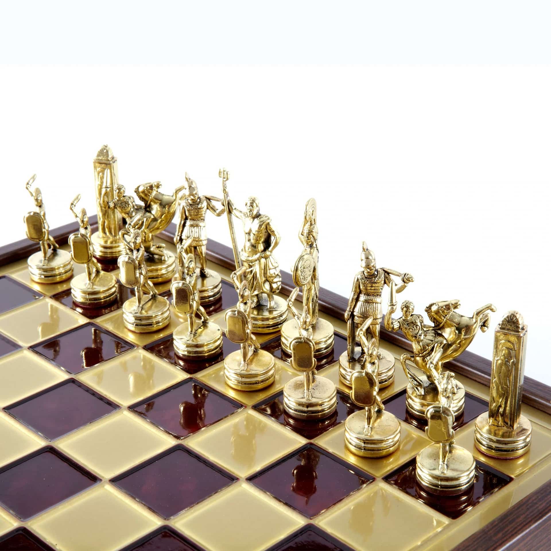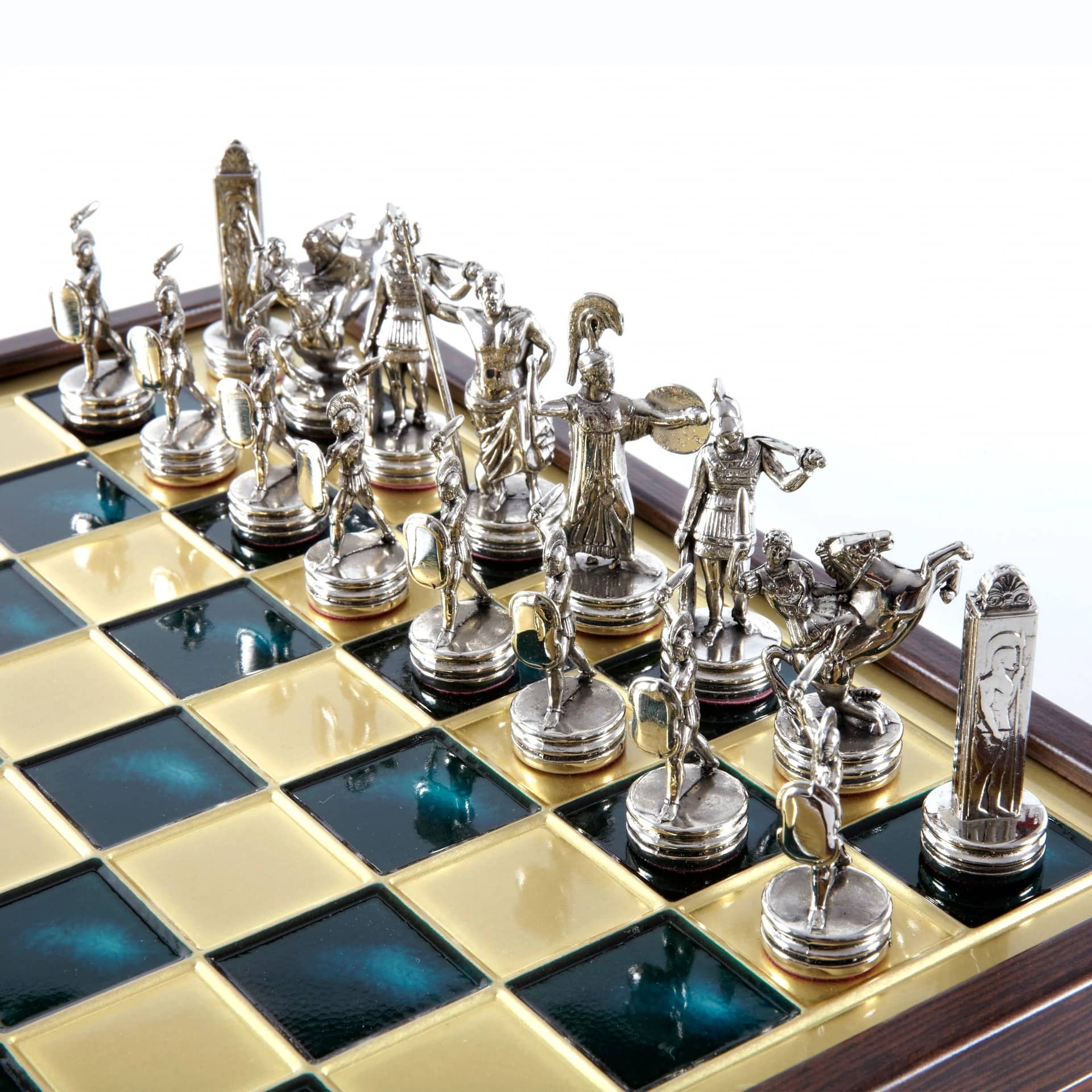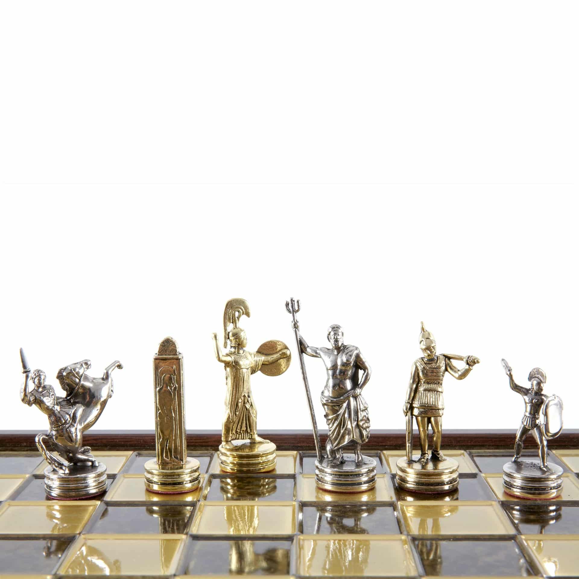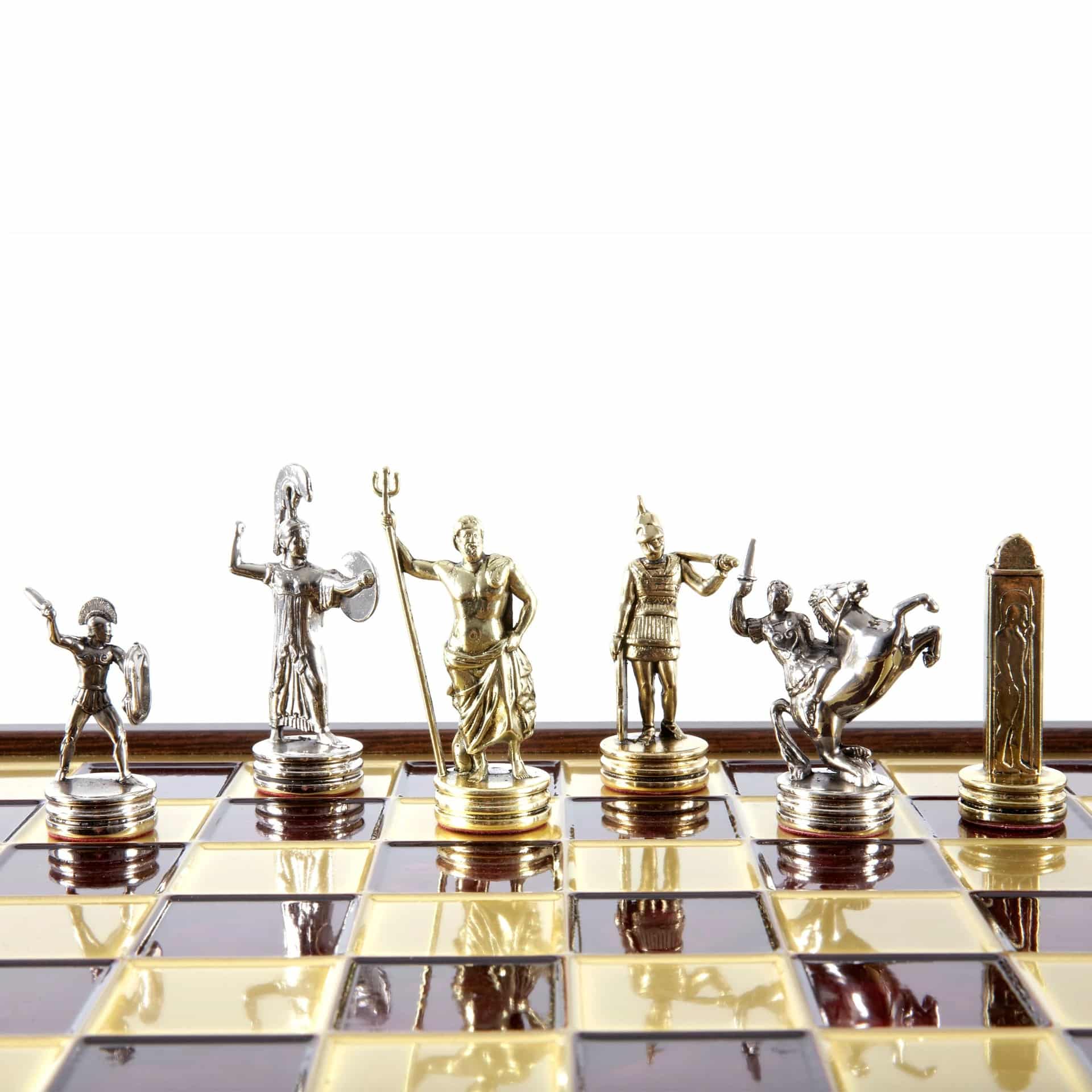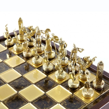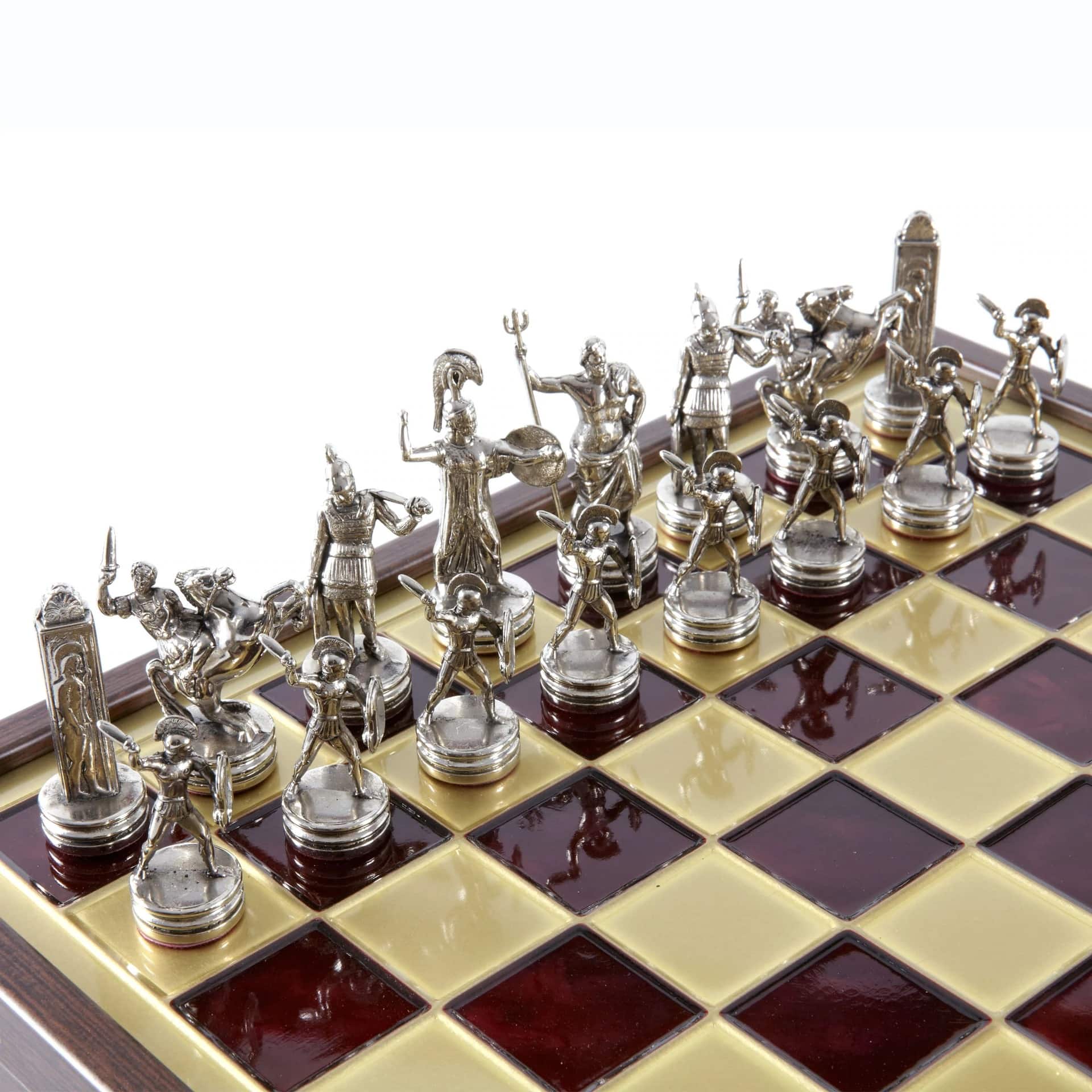 Juego de Ajedrez Mitología Griega en Metal Dorado y Plateado – Tablero con Almacenamiento Integrado