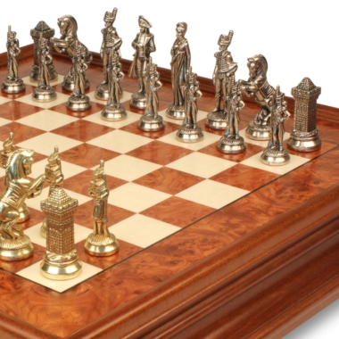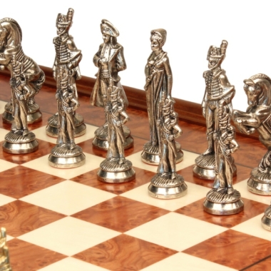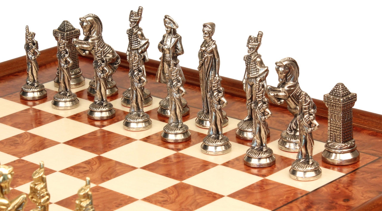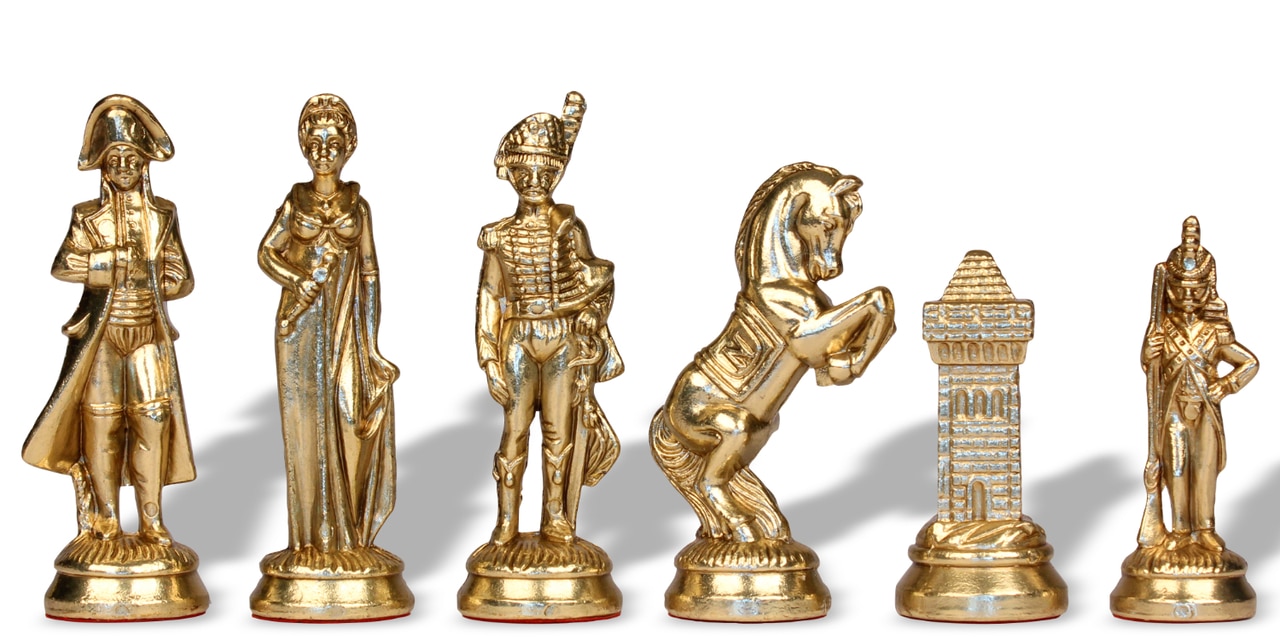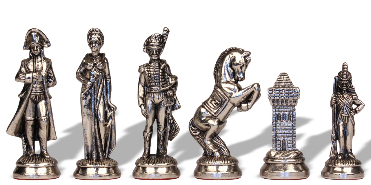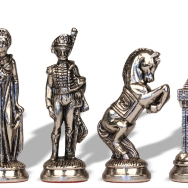 El juego de ajedrez Napoleón está fabricado en metal. Las piezas presentan numerosos detalles pulidos y cincelados a mano. Con una altura de rey de 10 cm es un verdadero placer manipularlas.