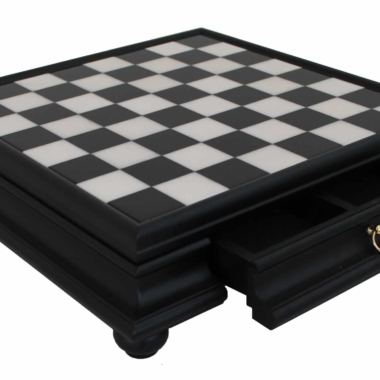 Incluye un cajón de almacenamiento, completamente forrado de fieltro y compartimentado en dos, que permite almacenar las piezas de ajedrez.