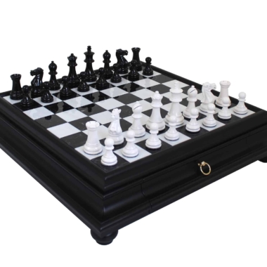 El conjunto incluye un tablero de ajedrez negro sobre pie de madera con un tablero de juego de alabastro de Toscana. Este tablero de lujo y de gran tamaño (47 x 47 x 10,5 cm) cuenta con numerosos acabados.