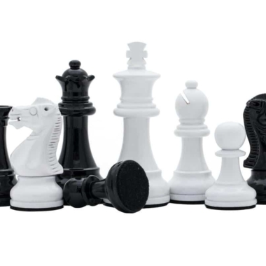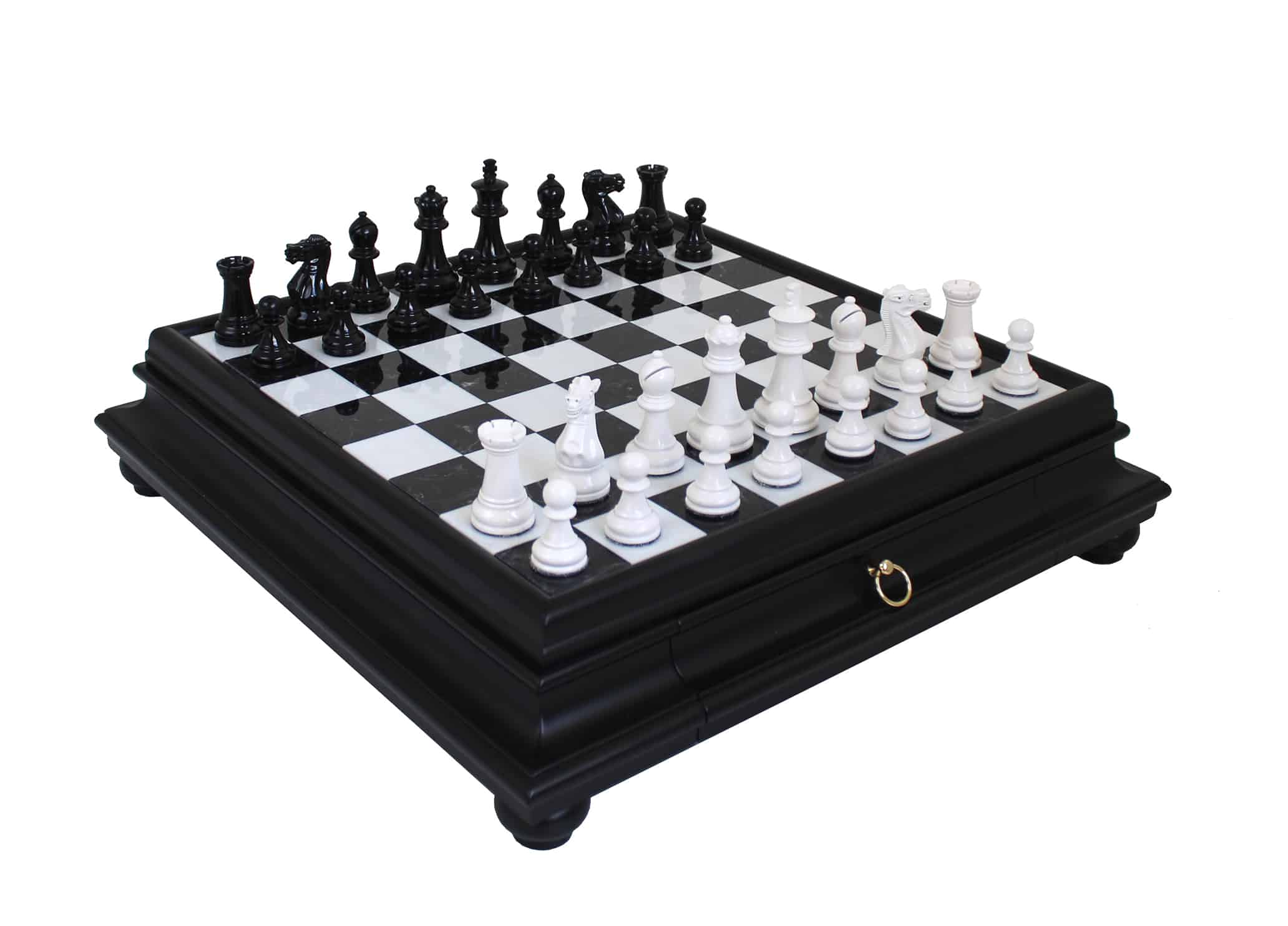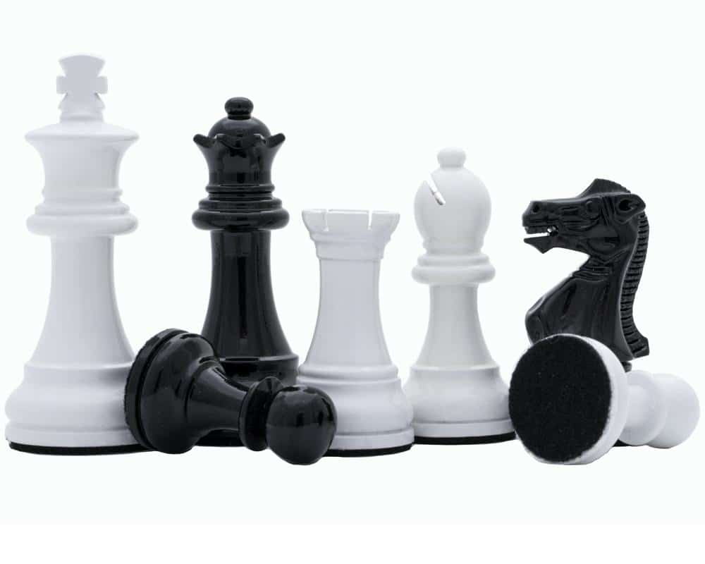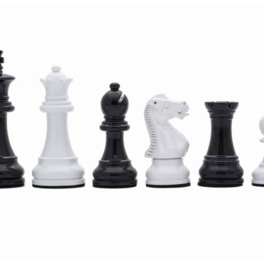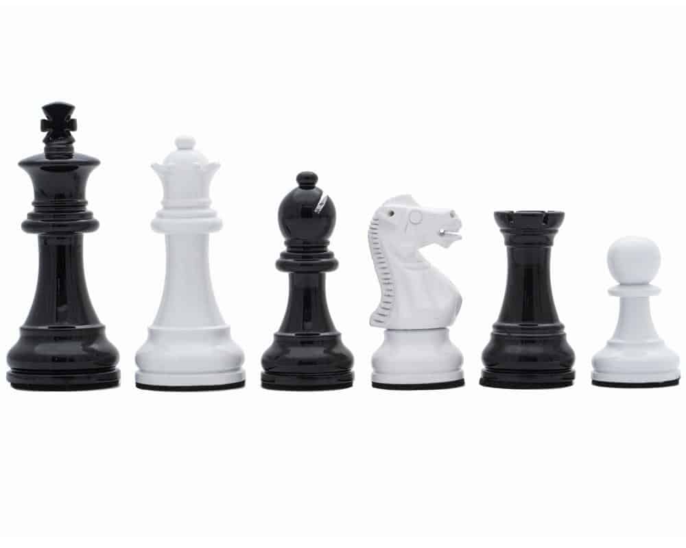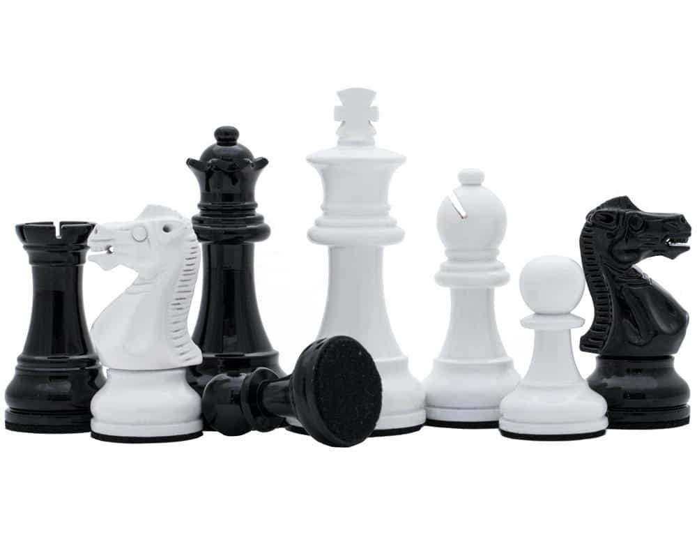 Asociado al tablero, encontramos piezas de ajedrez Staunton de madera lacada en negro y blanco, de apariencia moderna, tienen una altura de rey de 7,6 cm y se combinan perfectamente con el tablero sobre pie negro y blanco.