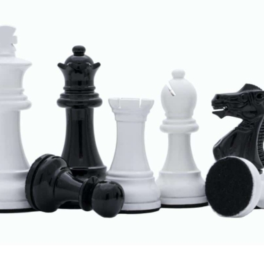 Un conjunto de juego de ajedrez moderno en tonos negro y blanco.