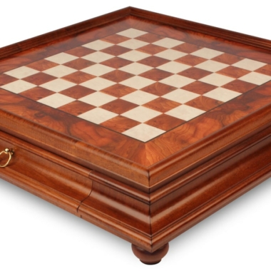 El tablero de juego de 53 x 53 cm elevado sobre sus 4 patas torneadas está realizado en madera de Olmo y madera de Brezo, integrando un cajón para guardar las piezas de ajedrez.