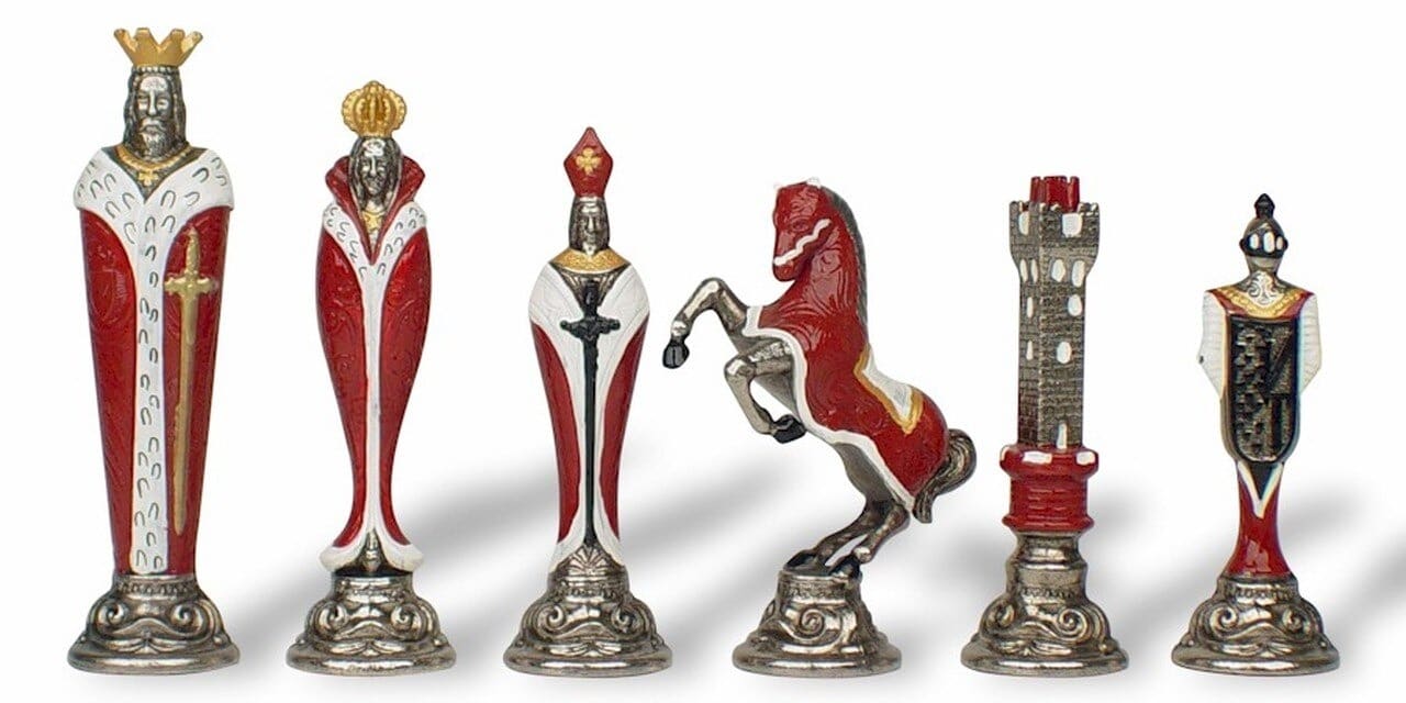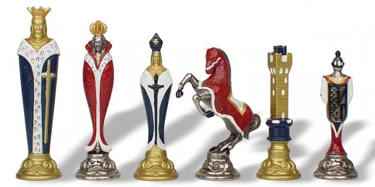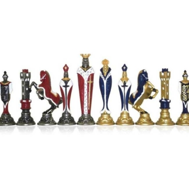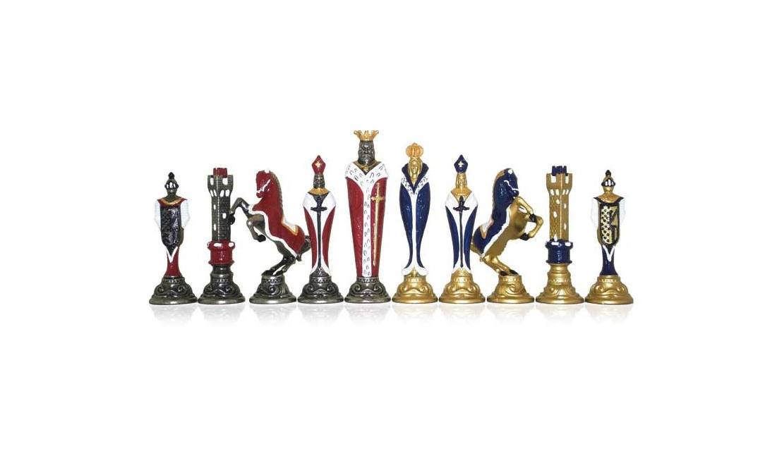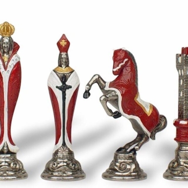 Magníficas piezas de ajedrez en metal completamente hechas a mano. Han necesitado largas horas de trabajo y pintadas a mano con muchos detalles con una altura de rey de 13,8 cm.