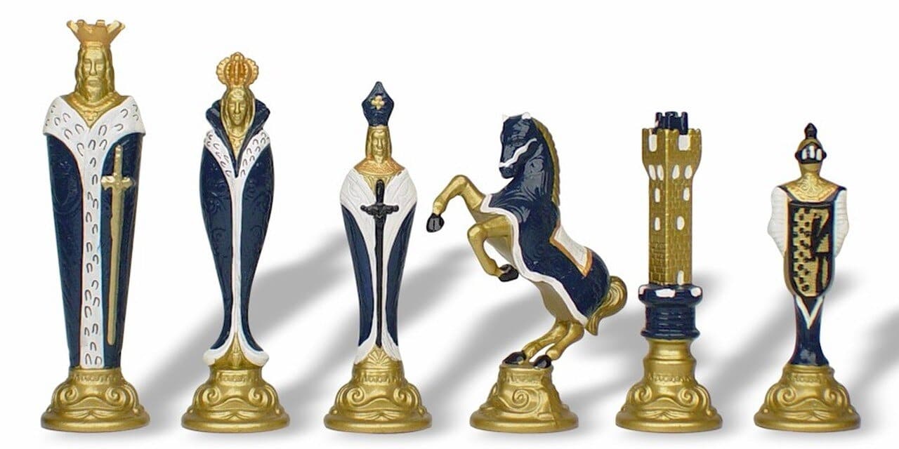 Juego de Ajedrez Renacimiento en Metal Pintado a Mano y Tablero de Ajedrez en Similcuero Dorado / Azul