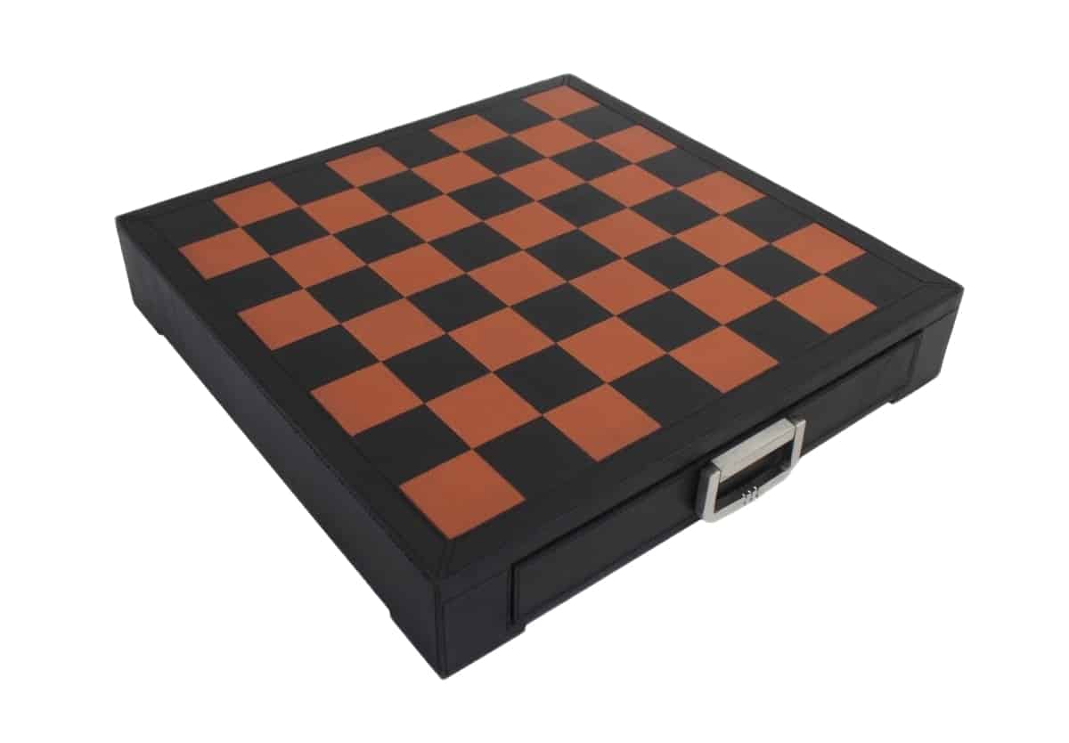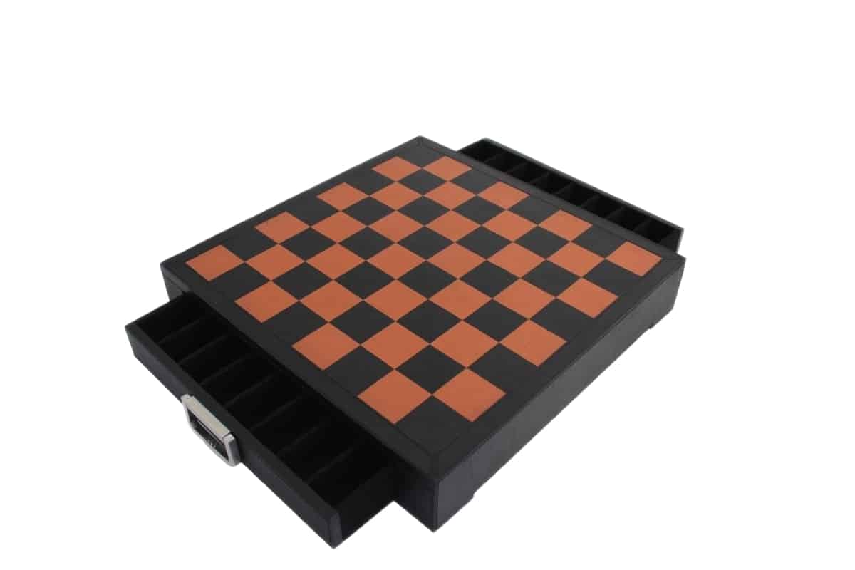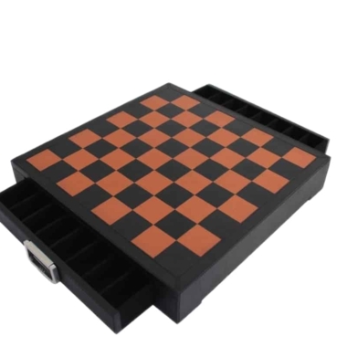 Vienen acompañadas de un tablero de 48 x 48 cm en cuero italiano verdadero incrustado a mano. El tablero incluye un cajón de almacenamiento que permite guardar el set de piezas de ajedrez.