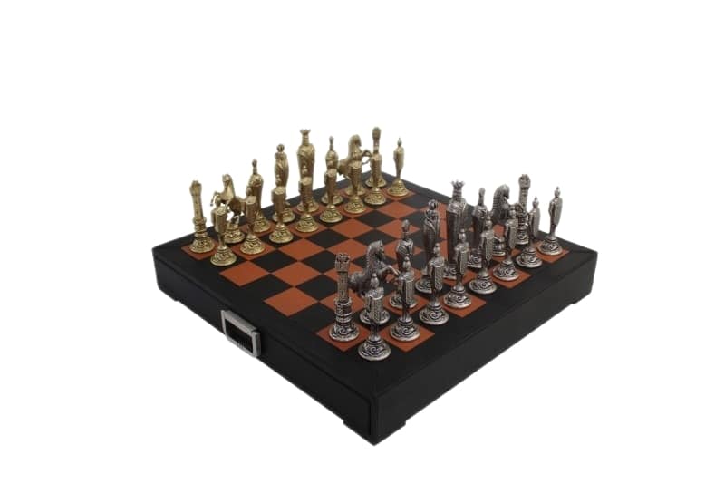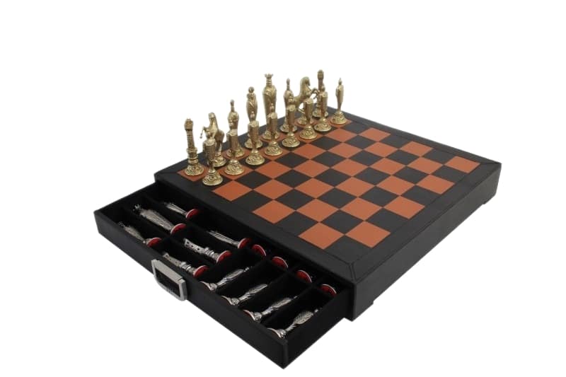 Juego de Ajedrez Renacimiento Florentino en Metal & Tablero de Ajedrez en Cuero Verdadero con Cajón de Almacenamiento