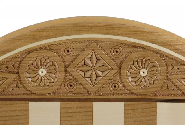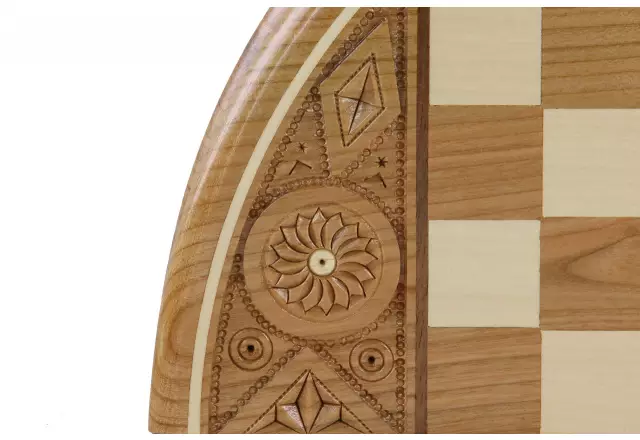 El rey, de una altura de 7 cm, sobrepasa elegantemente las otras piezas finamente elaboradas. El tablero circular de 34,5 cm de diámetro se destaca por su diseño original y sus casillas de 2,7 cm perfectamente proporcionadas.