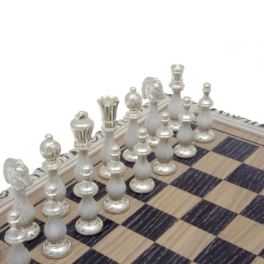 El tablero de ajedrez de madera de roble tiene unas dimensiones de 48 x 48 cm incluyendo el borde esculpido de manera compleja. Los motivos son clásicos sin ser exuberantes, la coloración es elegante sin ser pomposa y la superficie de juego es rústica pero no desgastada.