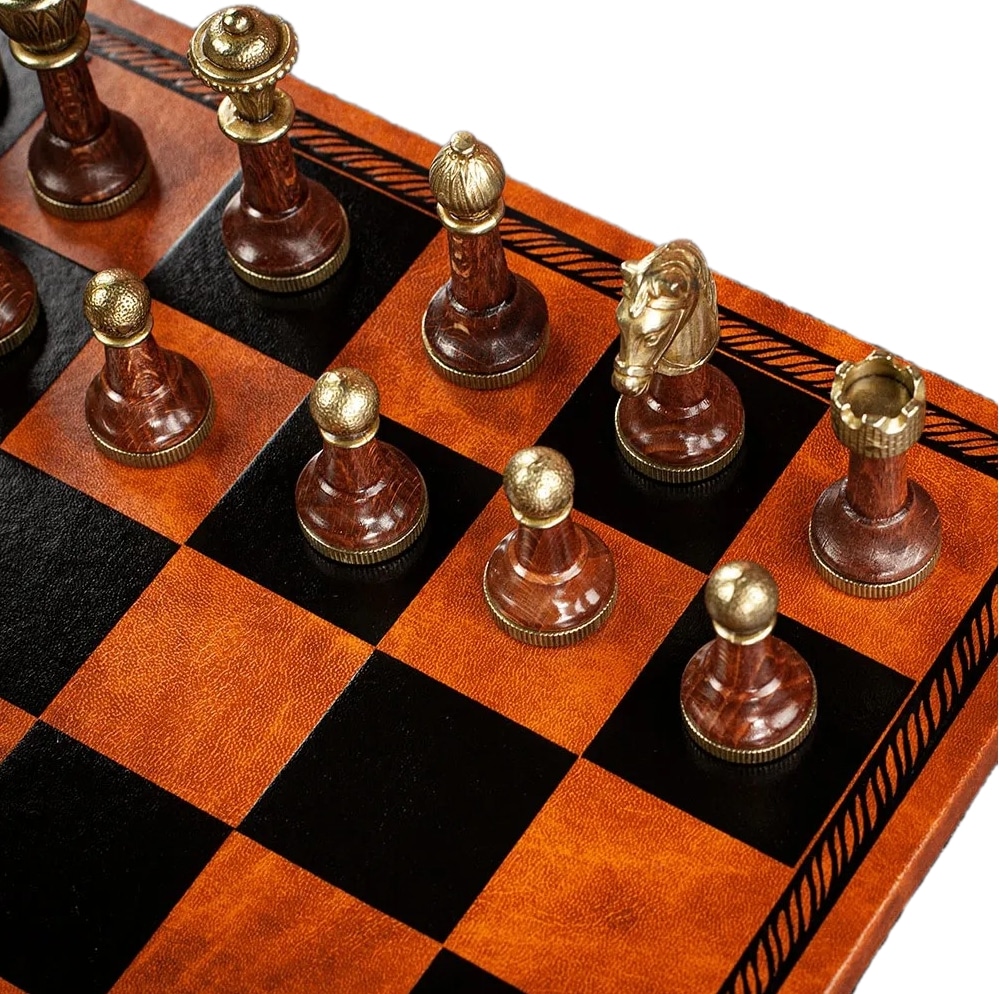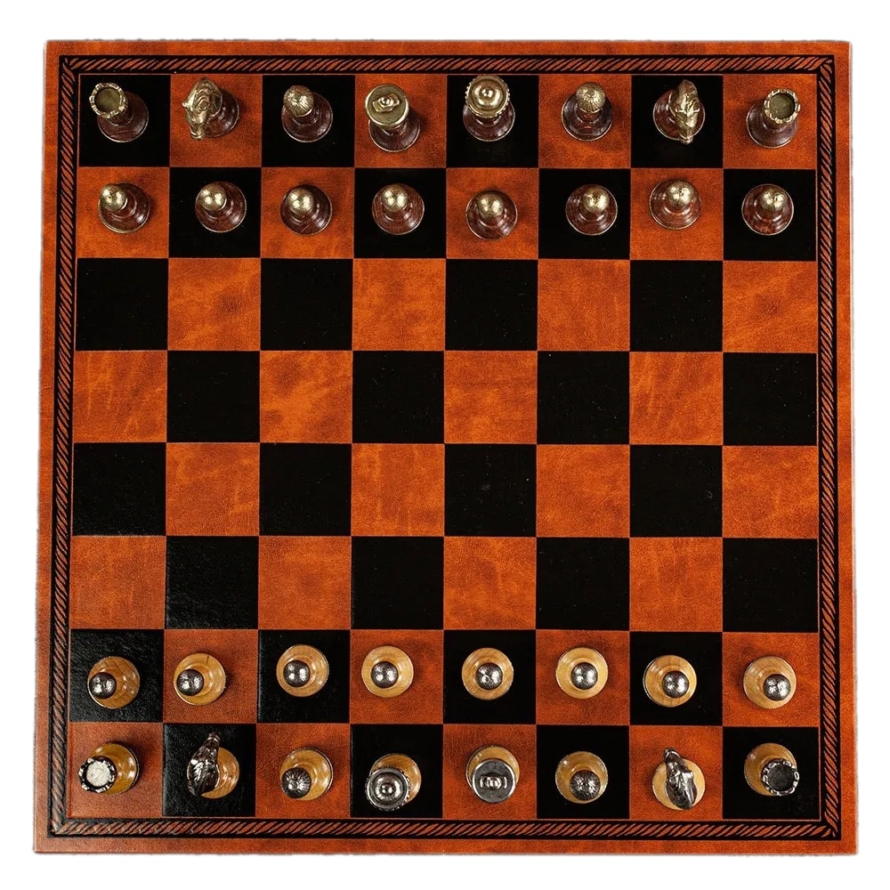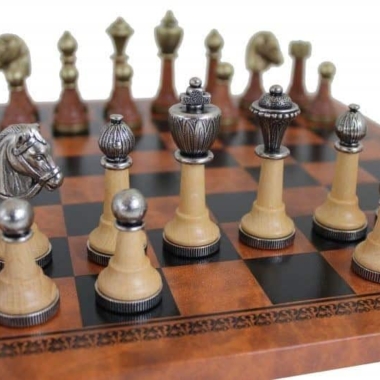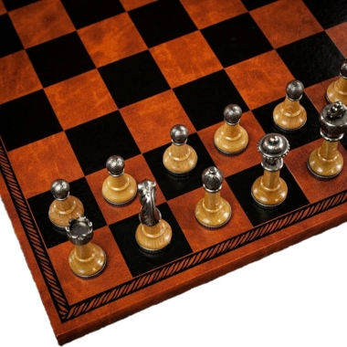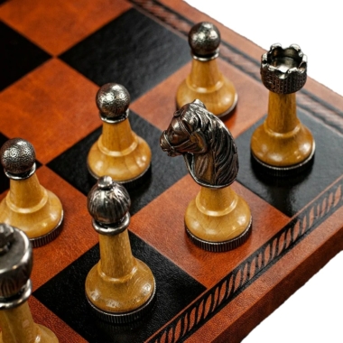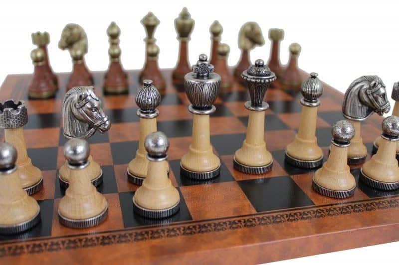 Juego de Ajedrez Staunton de Metal y Madera y Tablero de Ajedrez en Similcuero Marrón