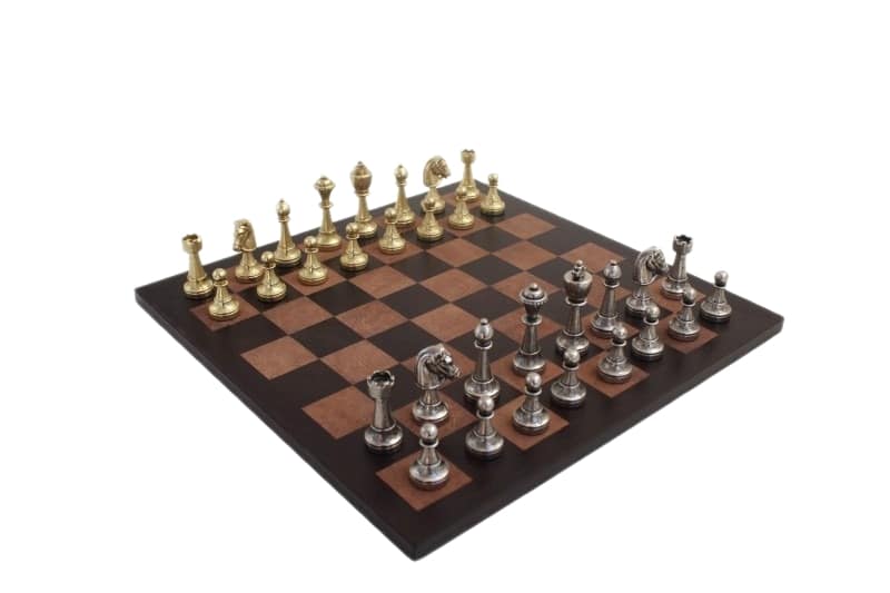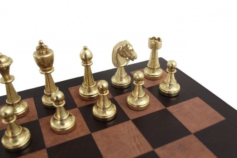Juego de Ajedrez Staunton en Metal & Tablero de Ajedrez en Cuero Verdadero