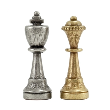 Las piezas de ajedrez están realizadas en un estilo Staunton, esculpidas y pulidas a mano en metal. Son ponderadas y bien equilibradas, una a una. Su altura de rey de 7,5 cm es cómoda.