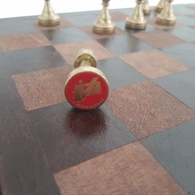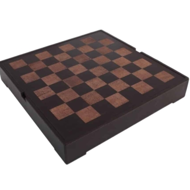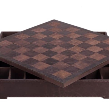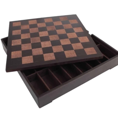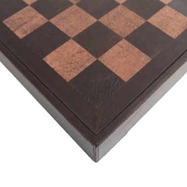 El tablero de ajedrez de una dimensión de 40 x 40 cm está fabricado en cuero verdadero italiano con un compartimento de almacenamiento debajo del tablero de juego para guardar la totalidad de las piezas de ajedrez.