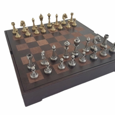Juego de Ajedrez Staunton en Metal y Tablero de Ajedrez en Cuero Verdadero con Compartimento de Almacenamiento
