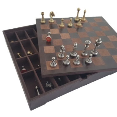 Juego de Ajedrez Staunton en Metal y Tablero de Ajedrez en Cuero Verdadero con Compartimento de Almacenamiento