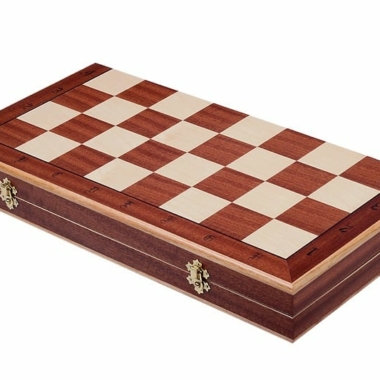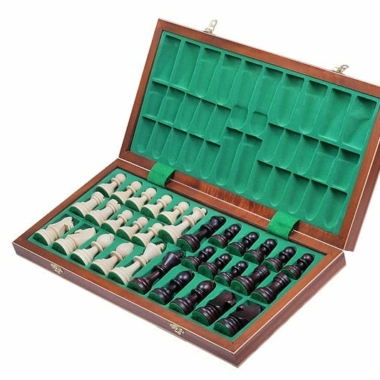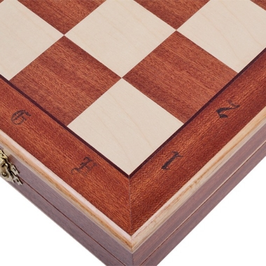 Las figuras Staunton vienen acompañadas de un gran tablero plegable, con dimensiones de 50 x 50 x 3 cm abierto (50 x 25 x 6 cm plegado) incrustado en madera de caoba y de sicómoro. Tiene un espacio para el almacenamiento de las piezas de ajedrez en su interior.