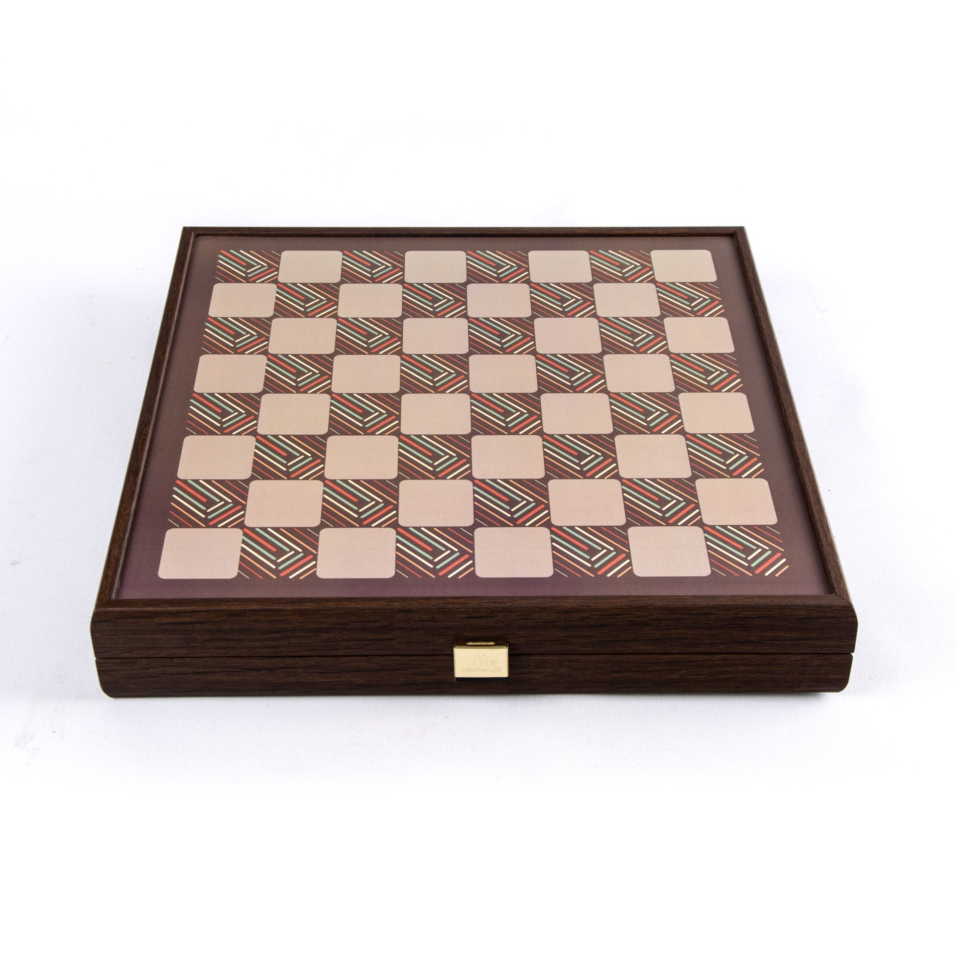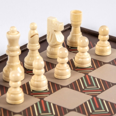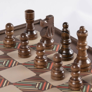 La caja está fabricada en madera laminada, con un acabado wengué. Todas las piezas, ya sean las piezas de ajedrez, las damas, o los piezas de ludo, también son de madera, asegurando durabilidad y estética natural.