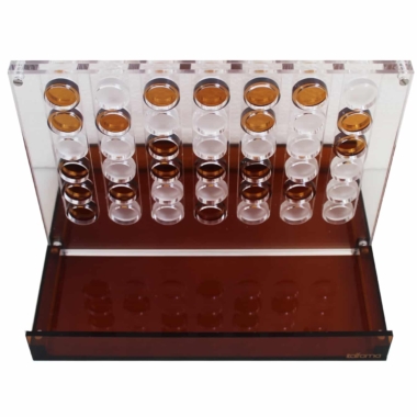 Realizado completamente en plexiglás en tonos naranjas transparentes, tiene unas dimensiones de 27 x 21 x 20 cm. Incluye un sistema de cierre magnético.