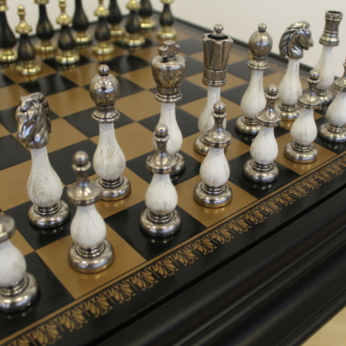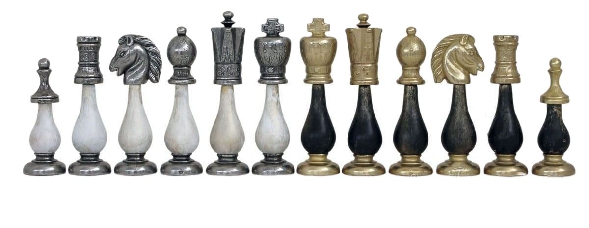 Las piezas de ajedrez tienen una altura de rey de 10,2 cm, están realizadas en metal y madera, completamente esculpidas y pulidas a mano, la parte de madera está decapada con un acabado negro y blanco. Bien equilibradas, es un verdadero placer manipularlas.