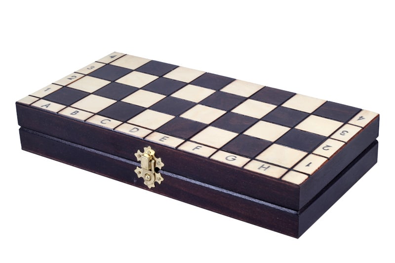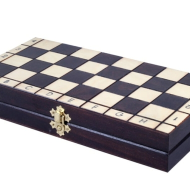 El tablero de ajedrez de madera alfanumérico es plegable, realizado en madera de haya y abeto tiene dos compartimentos con un forro de fieltro para el almacenamiento de las piezas de ajedrez. Su dimensión es de 30 x 30 x 2,5 cm abierto (30 x 15 x 5 cm plegado).