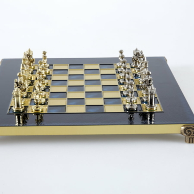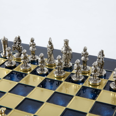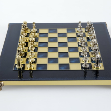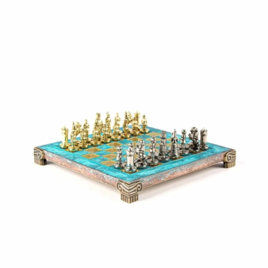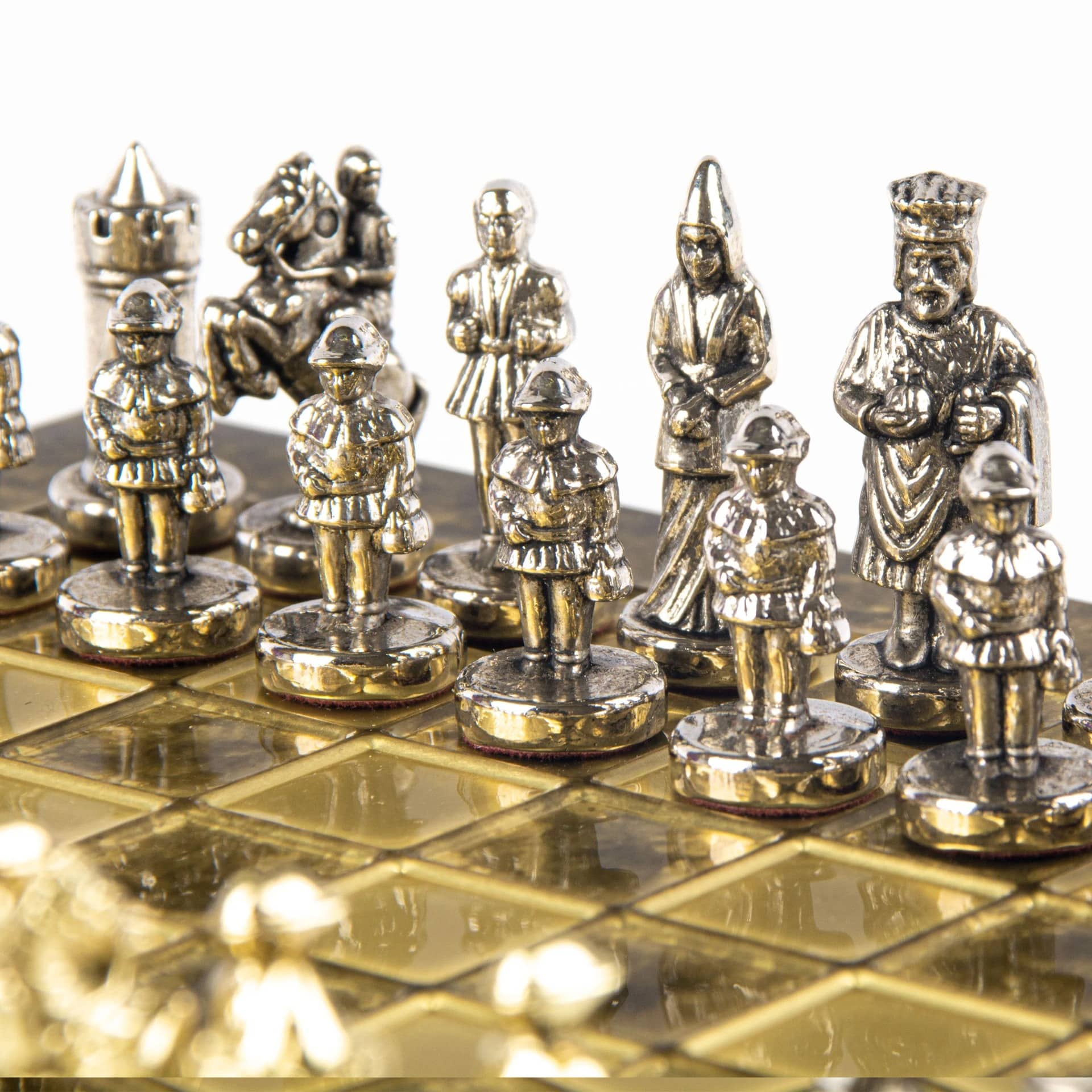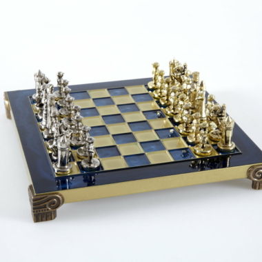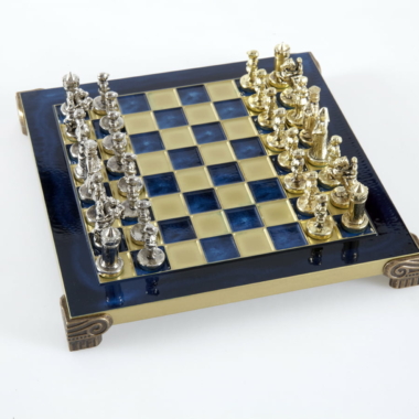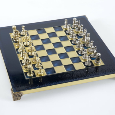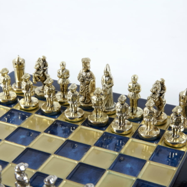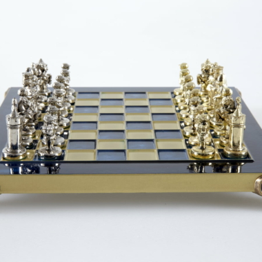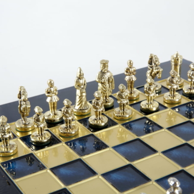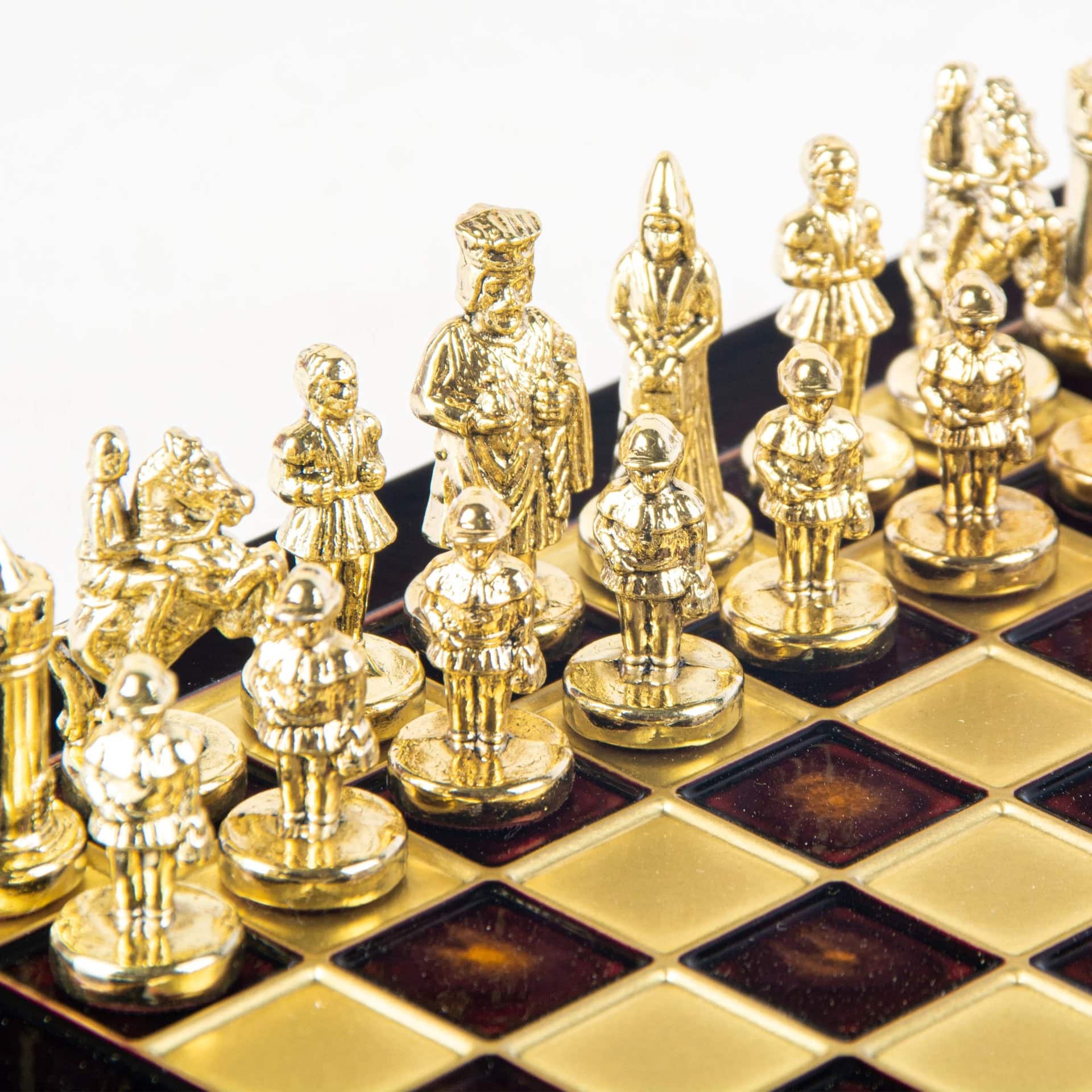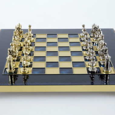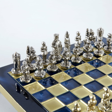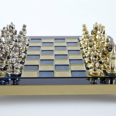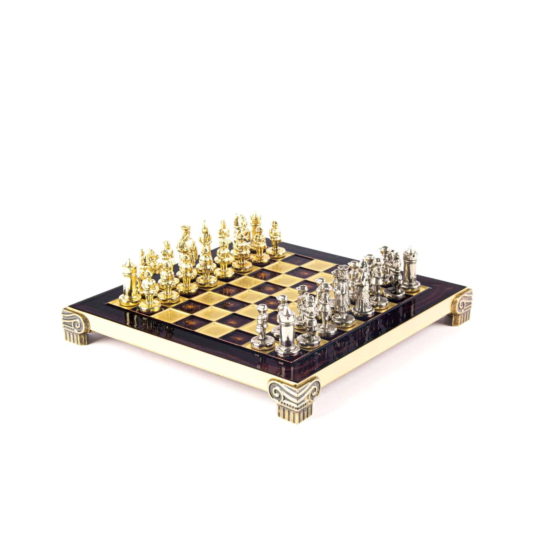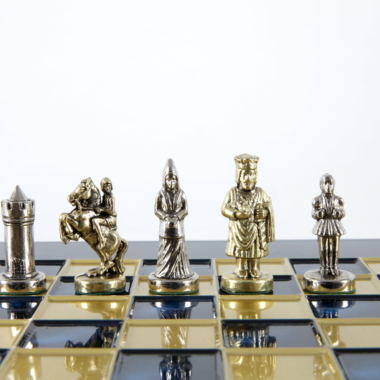 Las piezas de ajedrez están finamente esculpidas en metal dorado y plateado, representando las figuras emblemáticas del Imperio Bizantino. Cada pieza está meticulosamente diseñada para capturar la esencia de esta época gloriosa, con una altura de rey de 3,5 cm, perfecto para espacios pequeños.