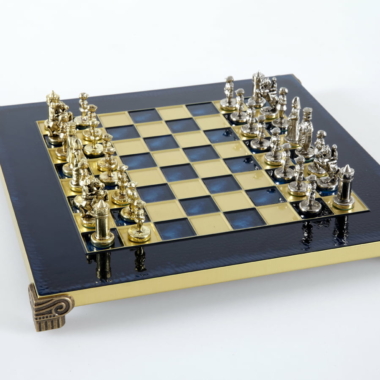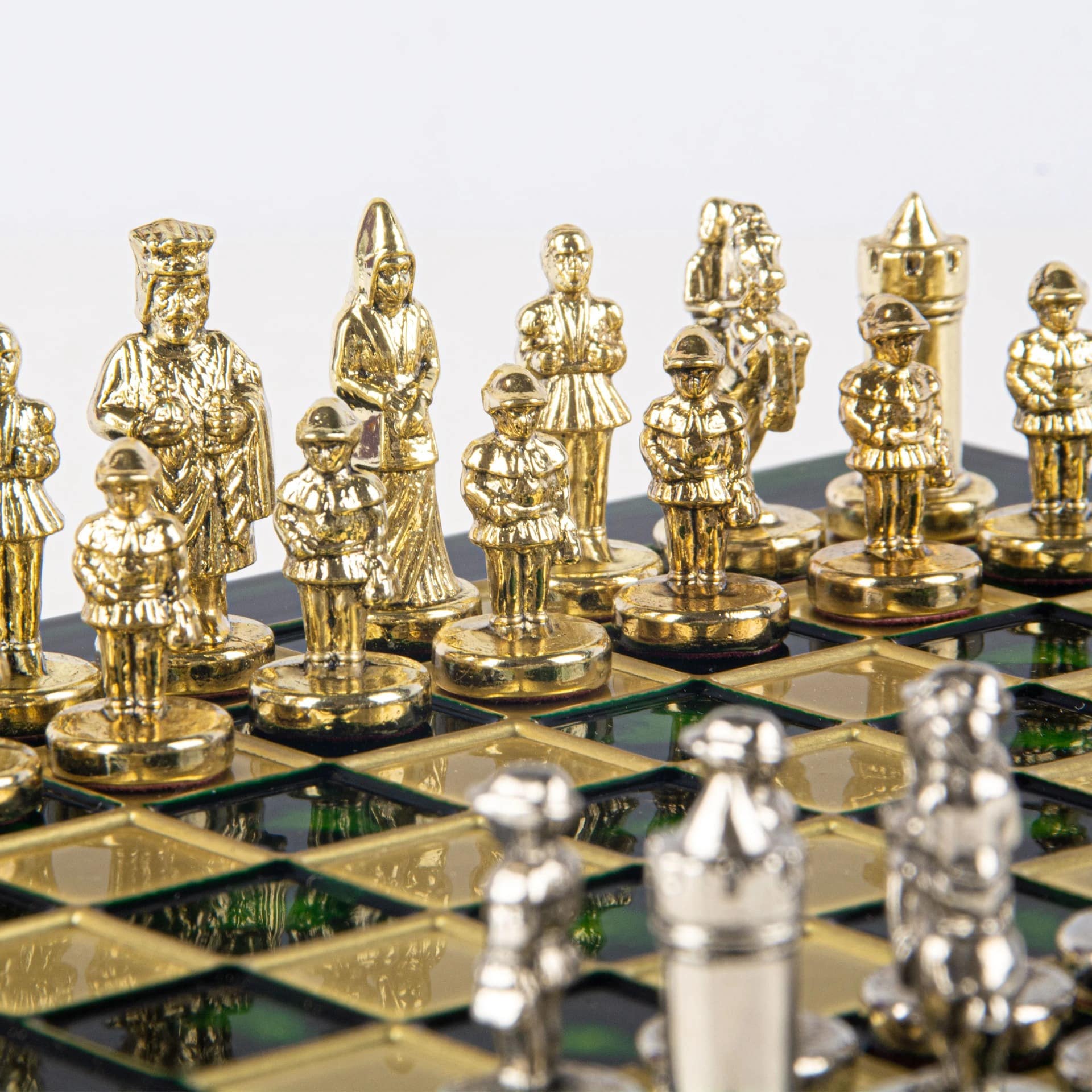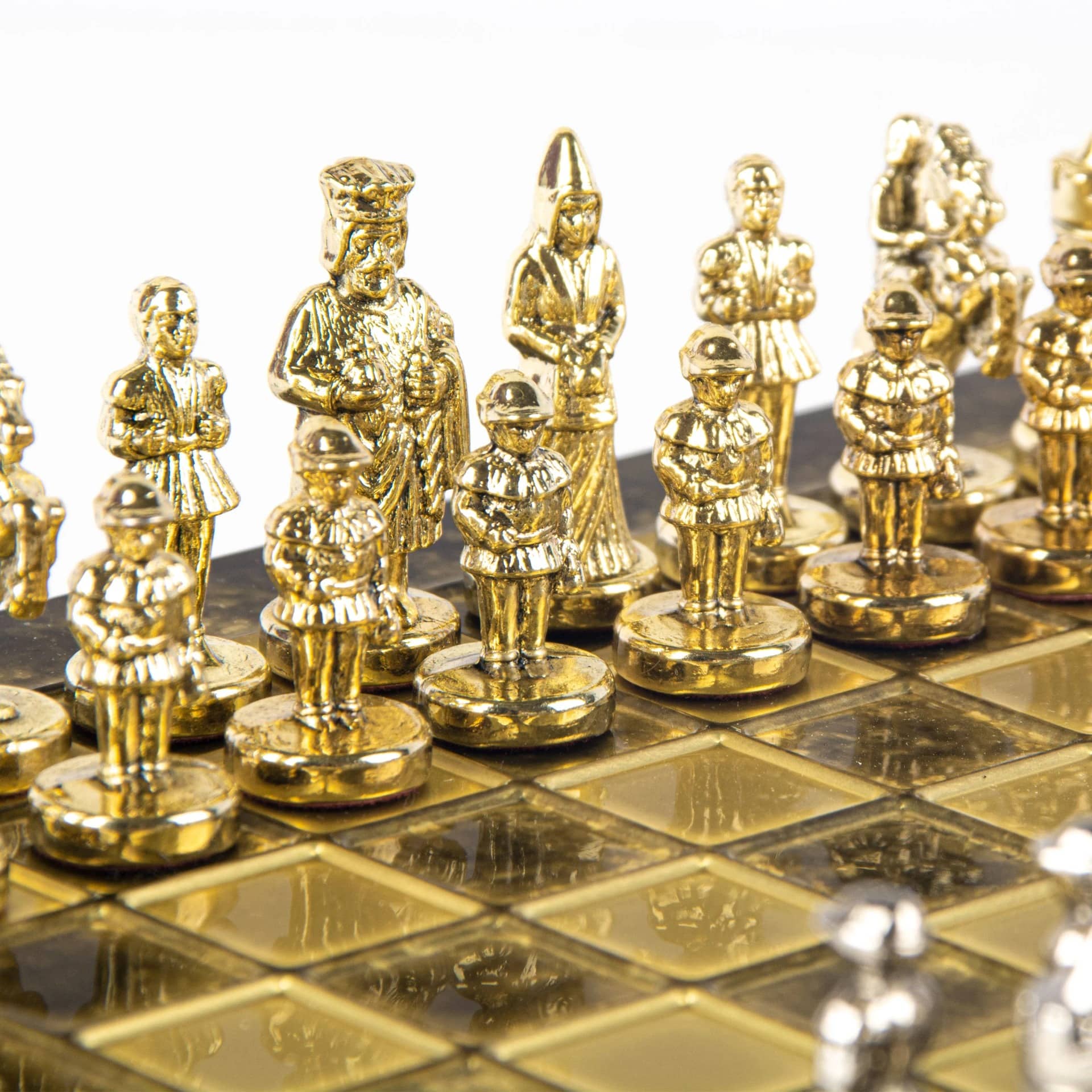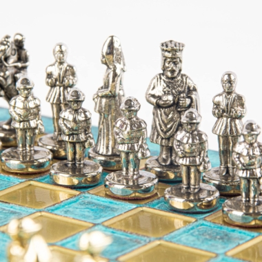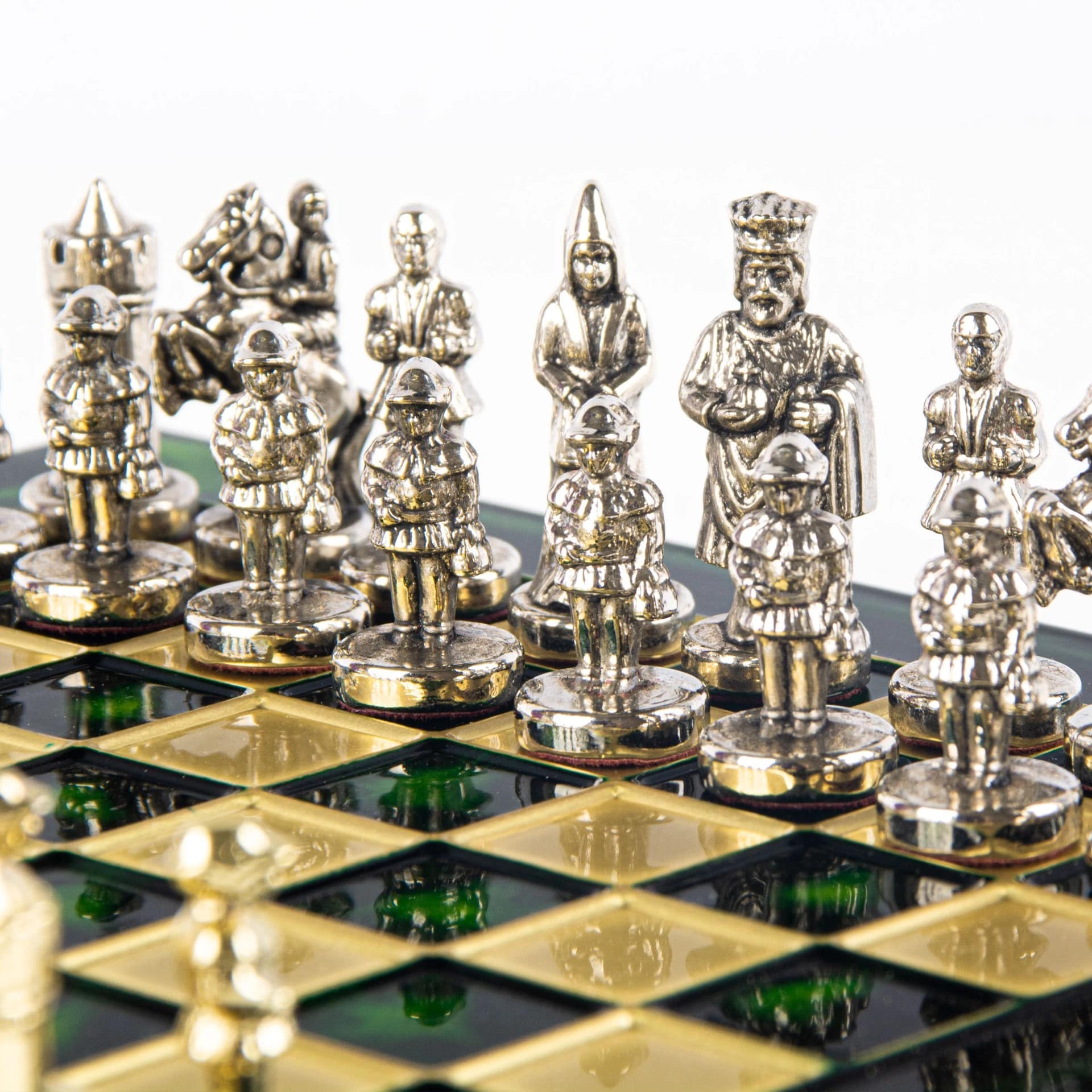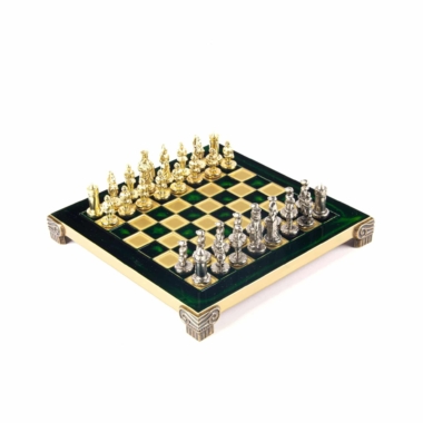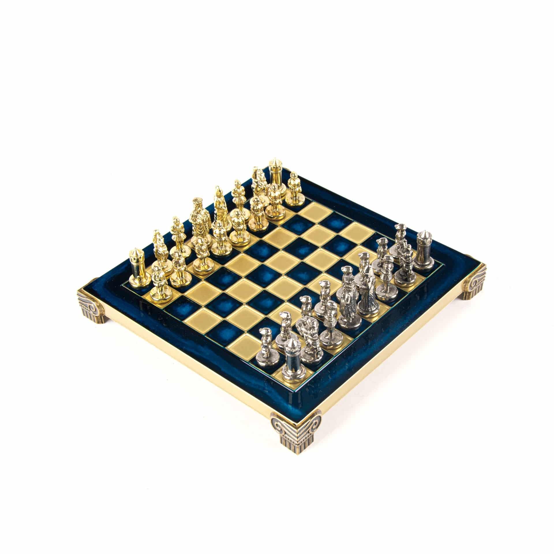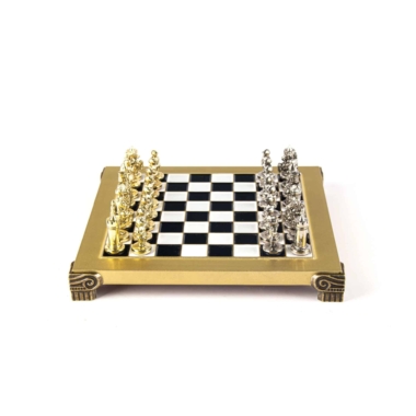 Las piezas de ajedrez están finamente esculpidas en metal dorado y plateado, representando las figuras emblemáticas del Imperio Bizantino. Cada pieza está meticulosamente diseñada para capturar la esencia de esta época gloriosa, con una altura de rey de 3,5 cm, perfecto para espacios pequeños.