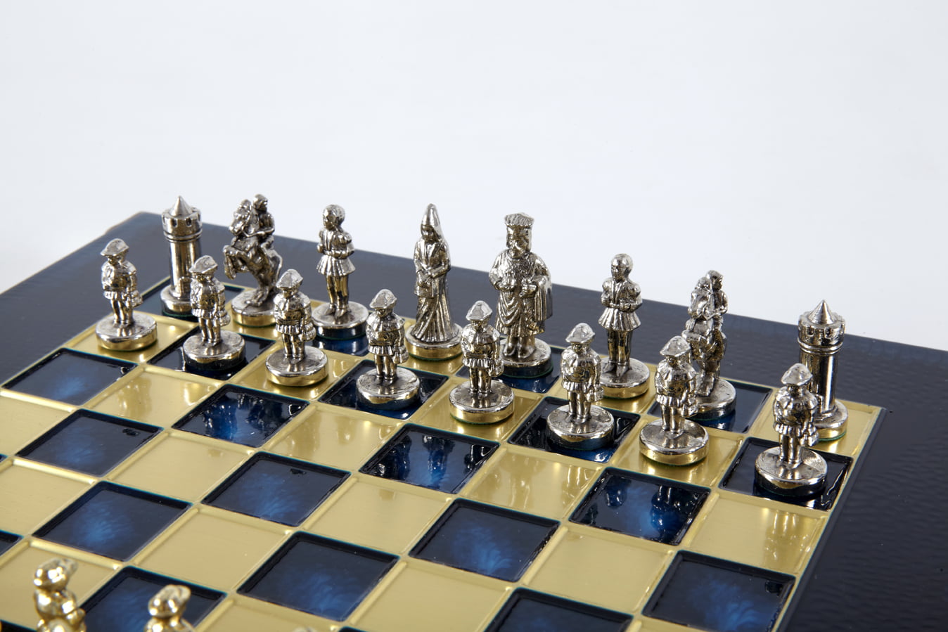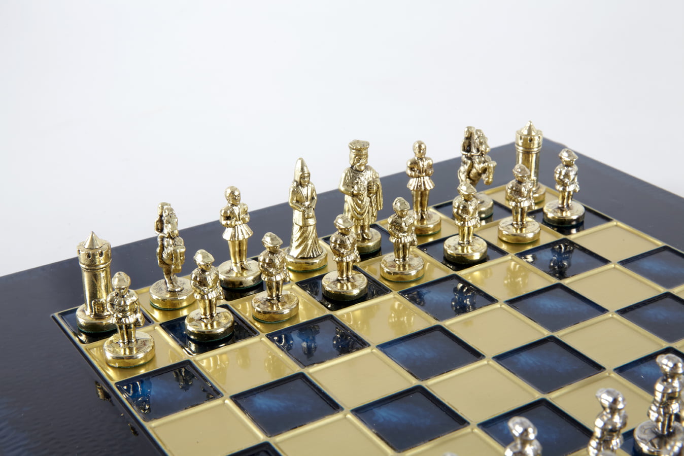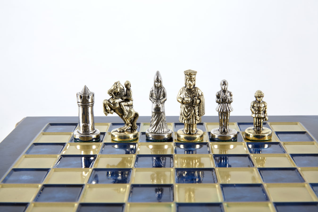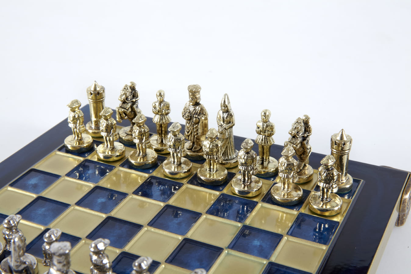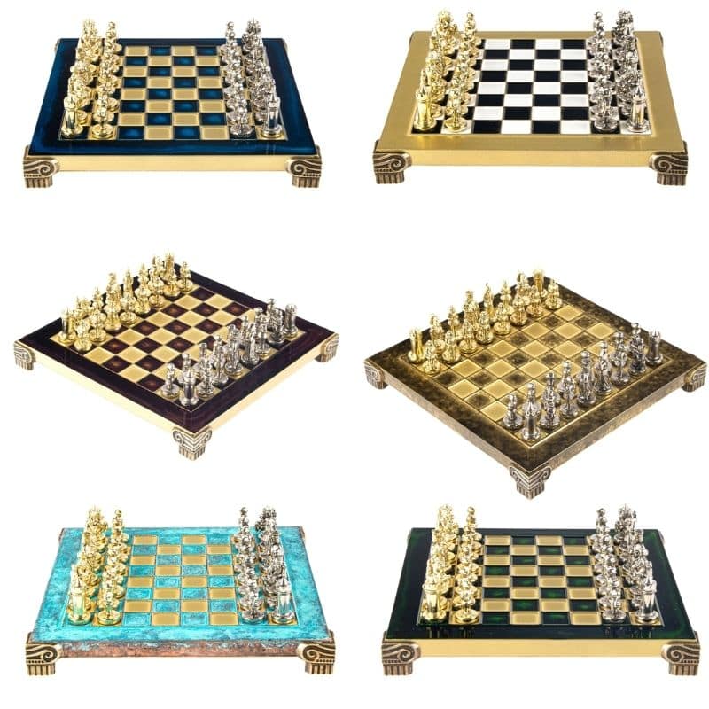 Las piezas de ajedrez están finamente esculpidas en metal dorado y plateado, representando las figuras emblemáticas del Imperio Bizantino. Cada pieza está meticulosamente diseñada para capturar la esencia de esta época gloriosa, con una altura de rey de 3,5 cm, perfecto para espacios pequeños.