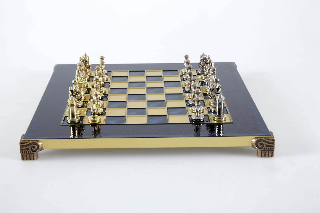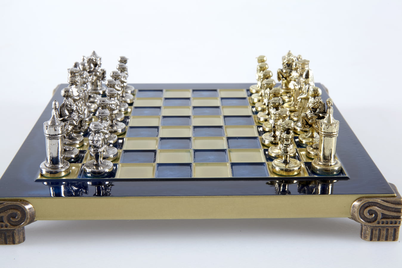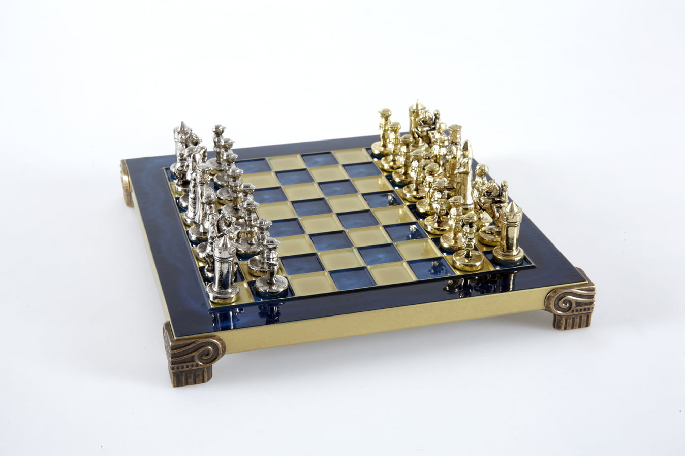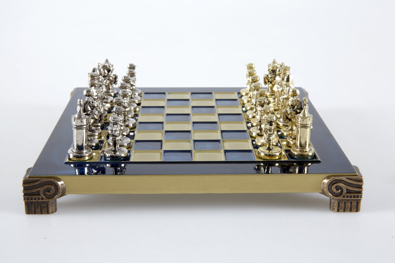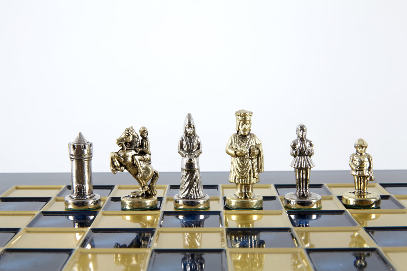 Las piezas de ajedrez están finamente esculpidas en metal dorado y plateado, representando las figuras emblemáticas del Imperio Bizantino. Cada pieza está meticulosamente diseñada para capturar la esencia de esta época gloriosa, con una altura de rey de 3,5 cm, perfecto para espacios pequeños.