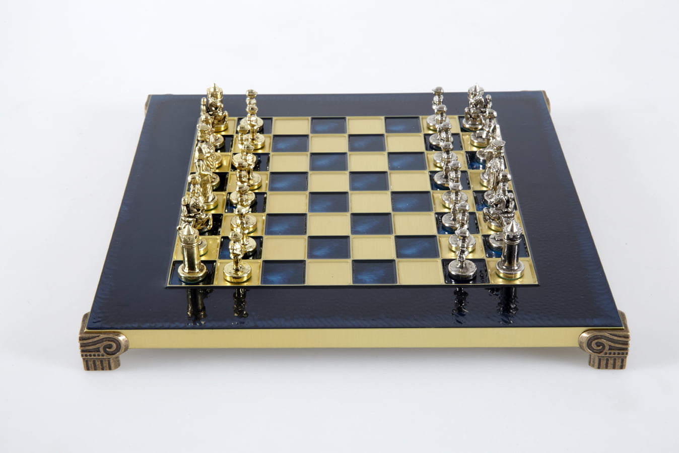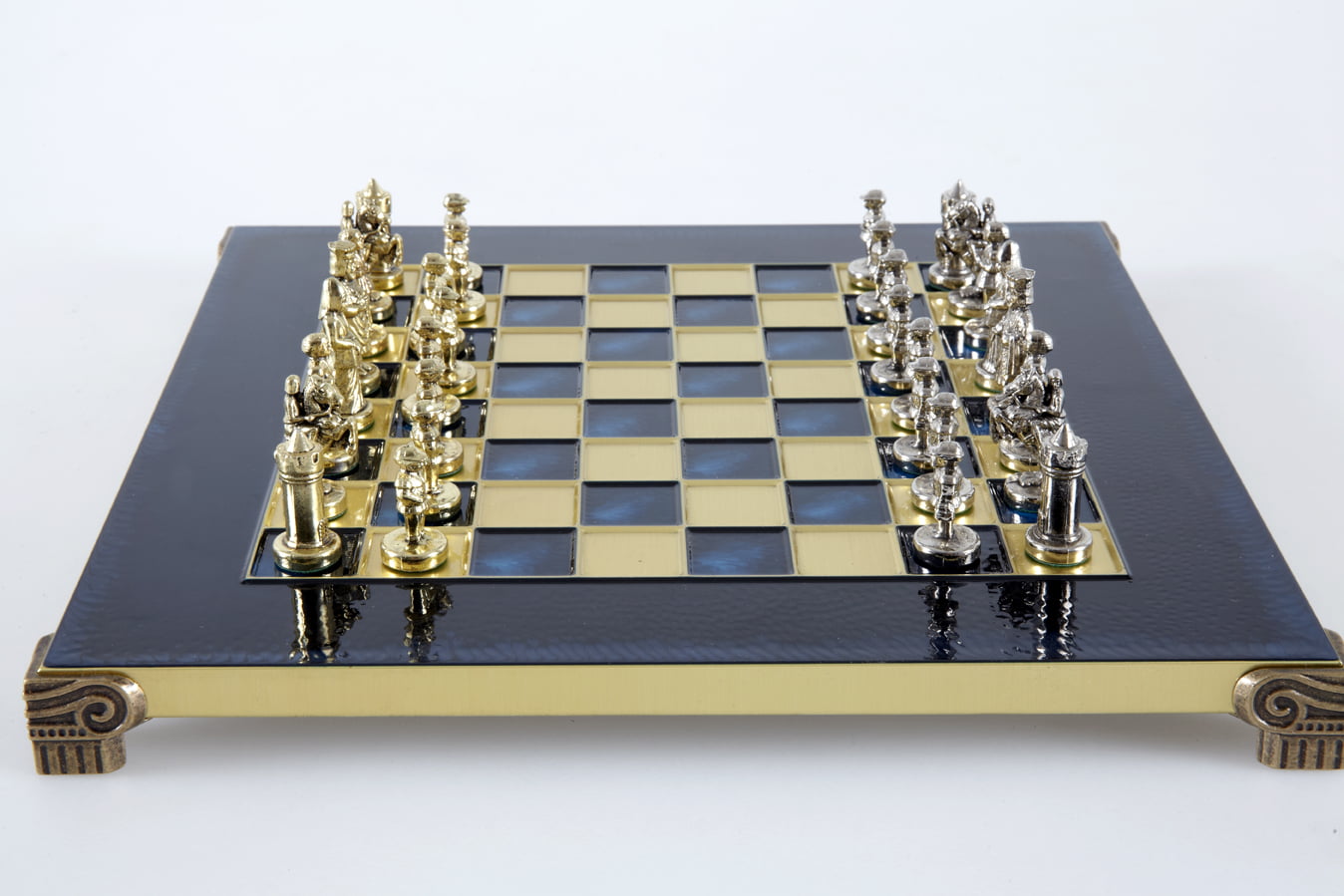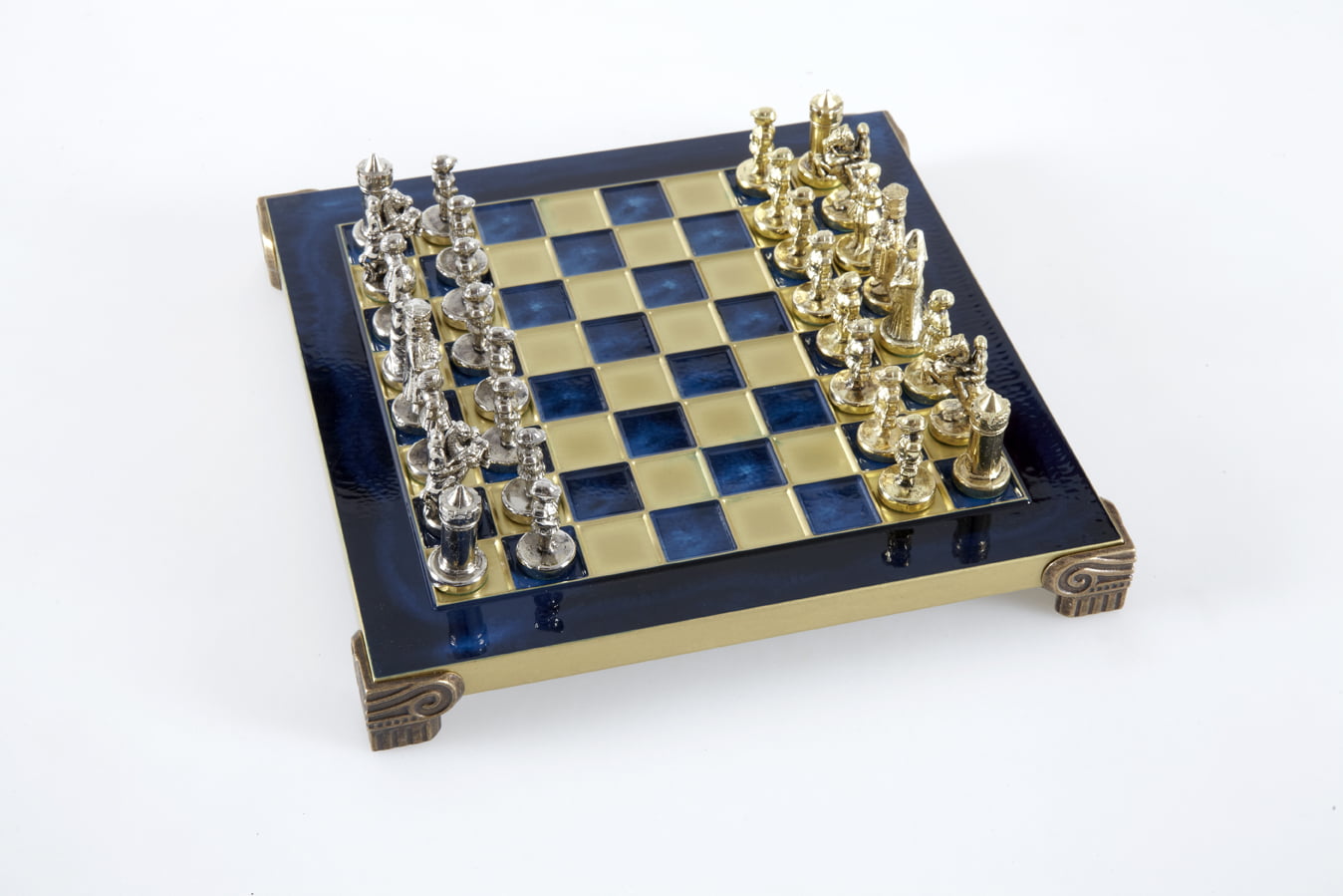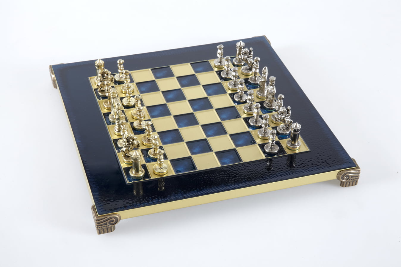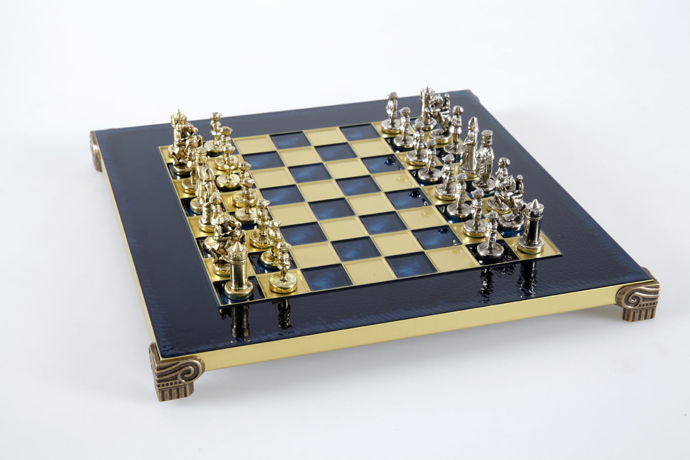 Las piezas de ajedrez están finamente esculpidas en metal dorado y plateado, representando las figuras emblemáticas del Imperio Bizantino. Cada pieza está meticulosamente diseñada para capturar la esencia de esta época gloriosa, con una altura de rey de 3,5 cm, perfecto para espacios pequeños.