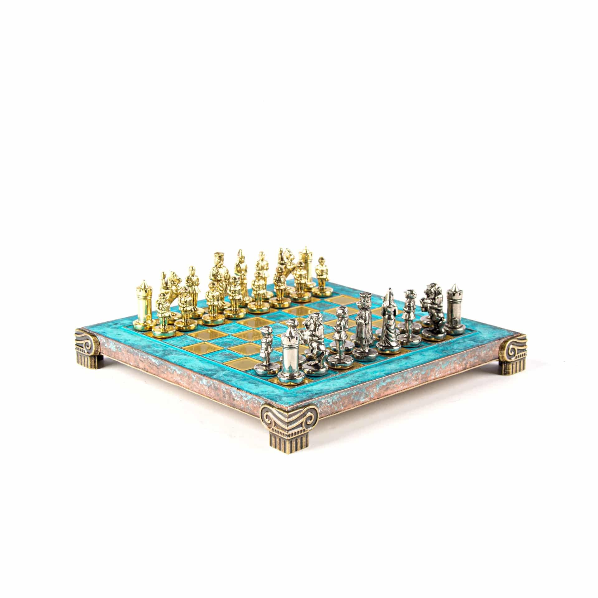 Pequeño Conjunto de Juego de Ajedrez Bizantino Piezas de Metal Oro & Plata con Tablero de Ajedrez de Metal y Caja de Almacenamiento