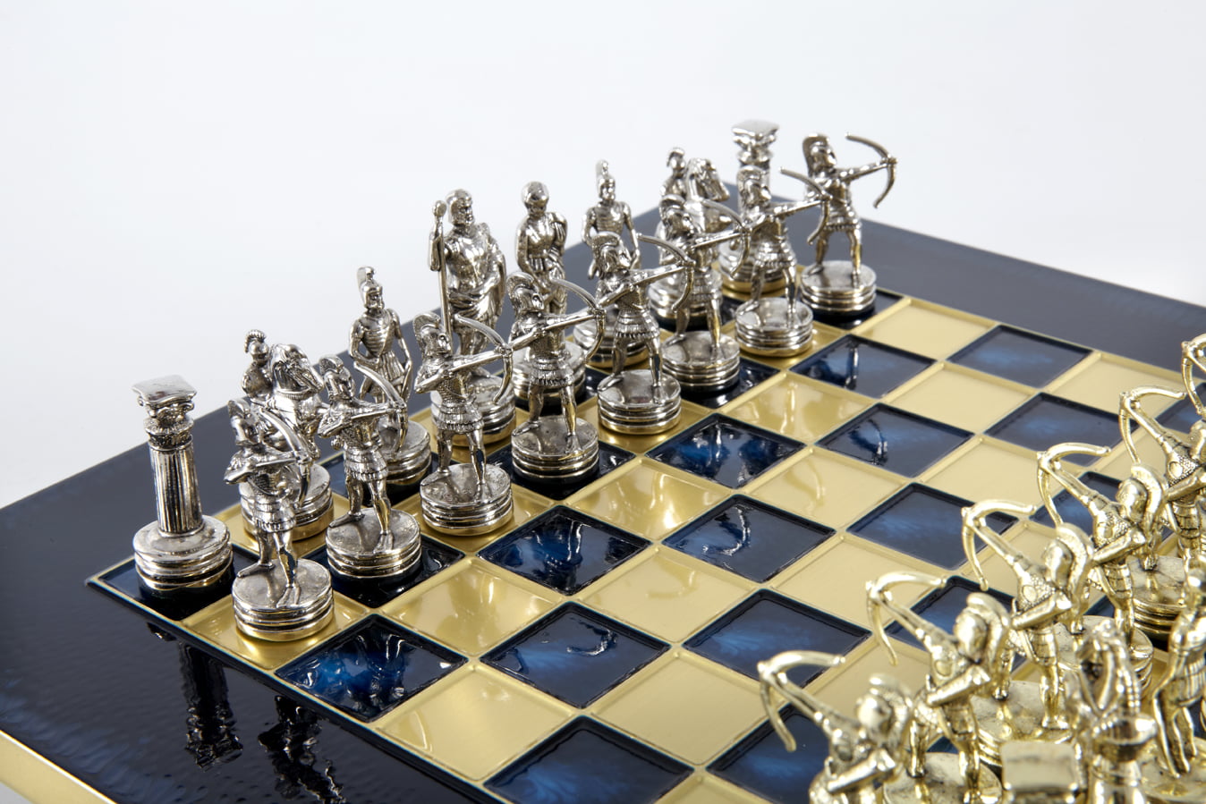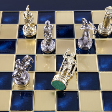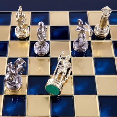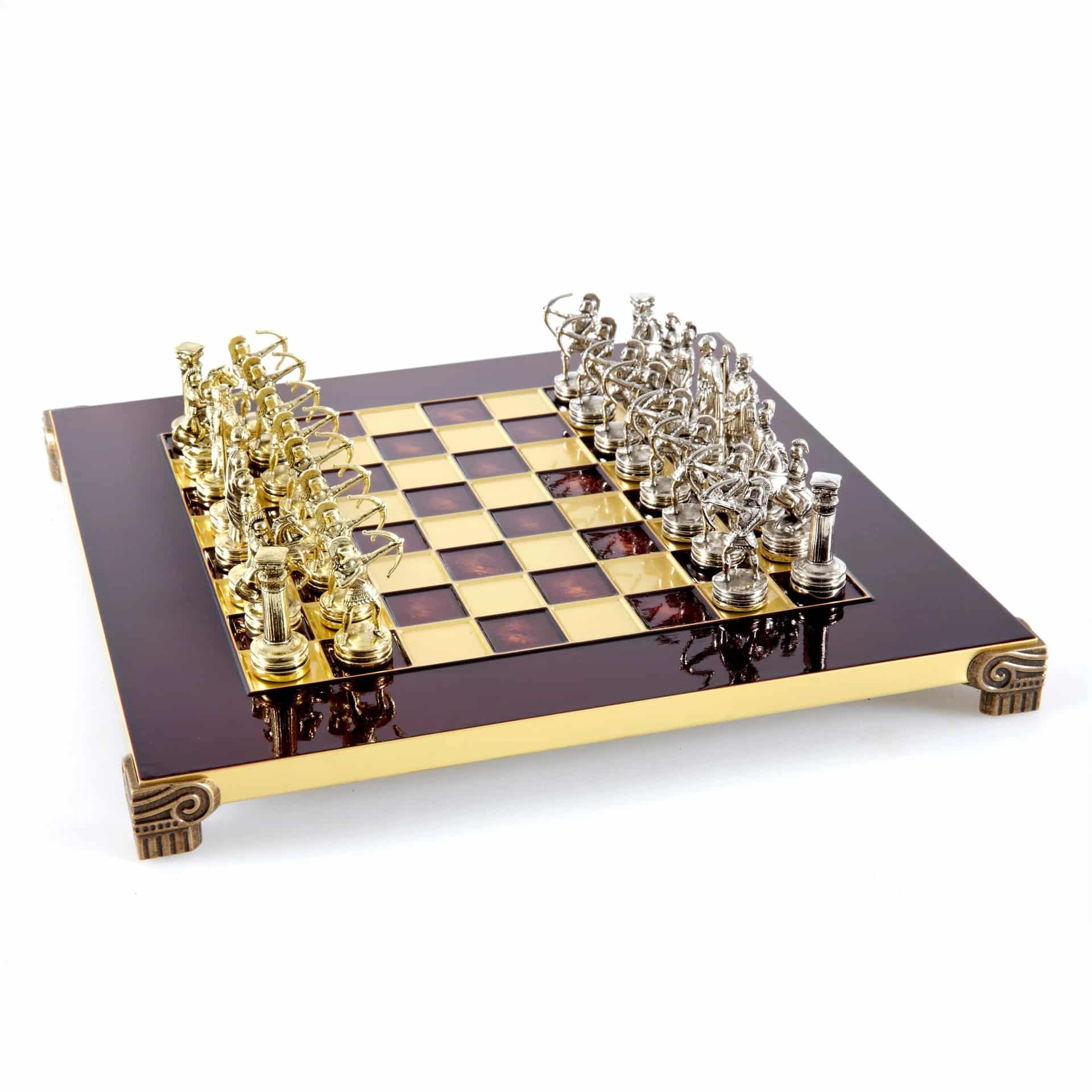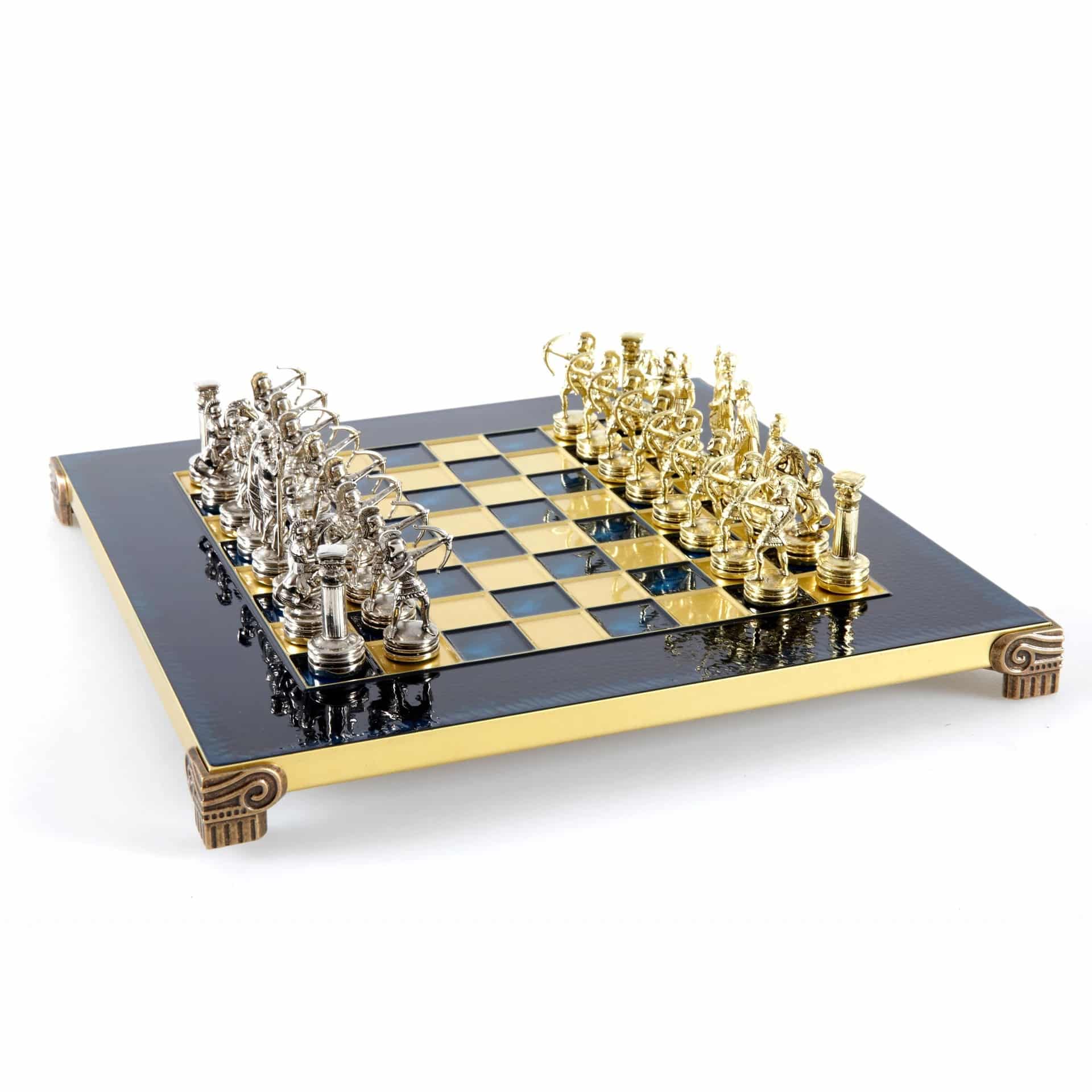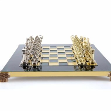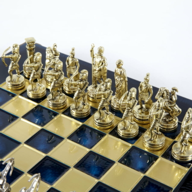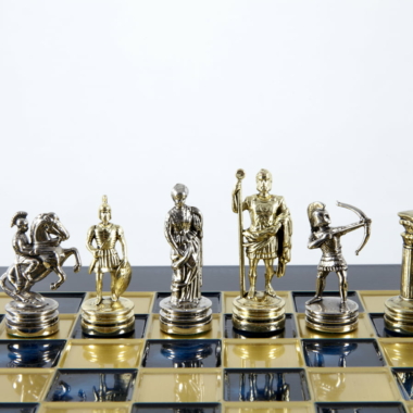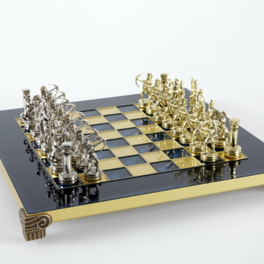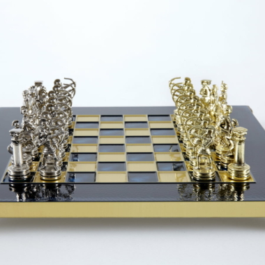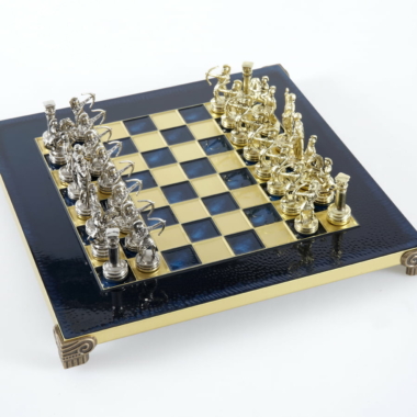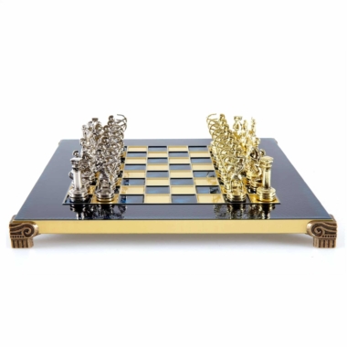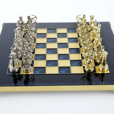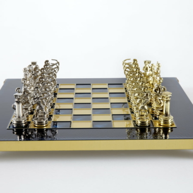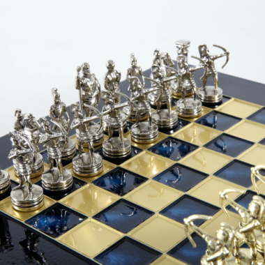 Pequeño Conjunto de Juego de Ajedrez en Metal Plateado y Dorado Arqueros – Estuche de Madera Laminada con Tablero de Ajedrez de Metal