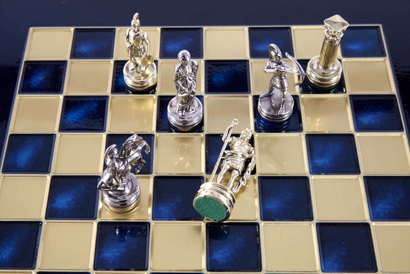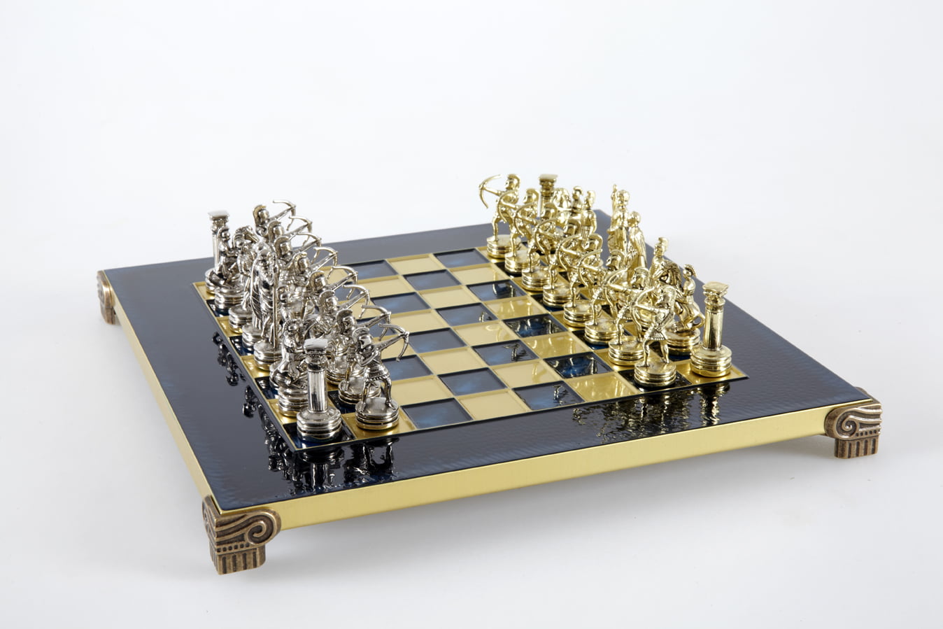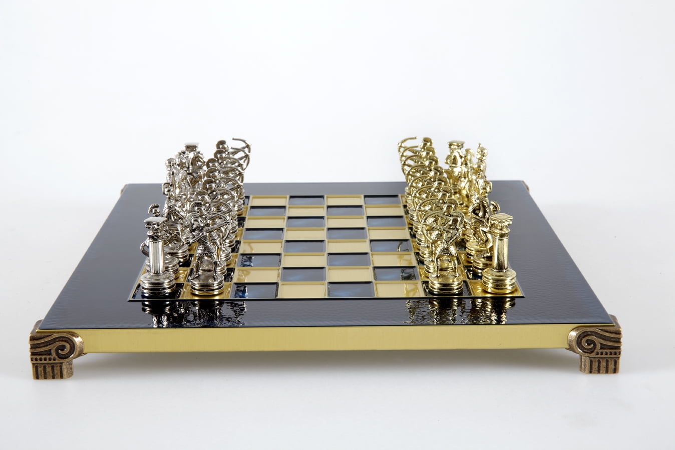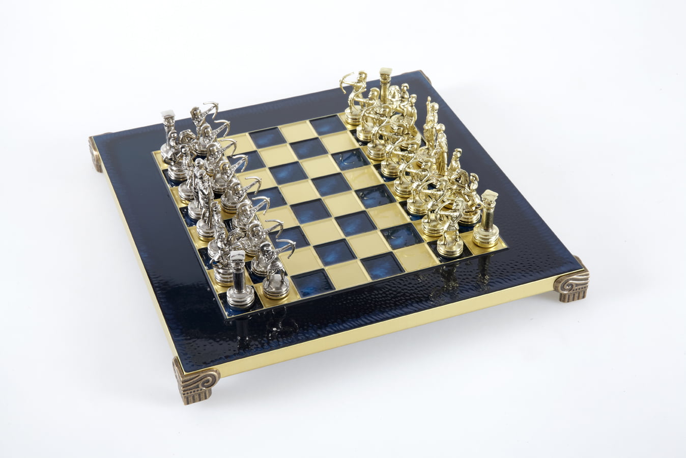 Pequeño Conjunto de Juego de Ajedrez en Metal Plateado y Dorado Arqueros – Estuche de Madera Laminada con Tablero de Ajedrez de Metal