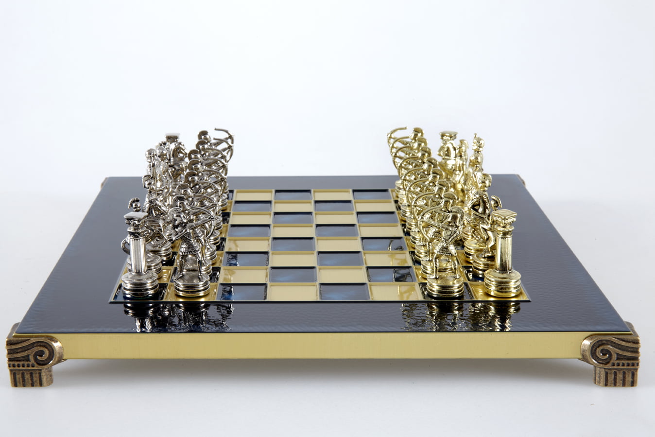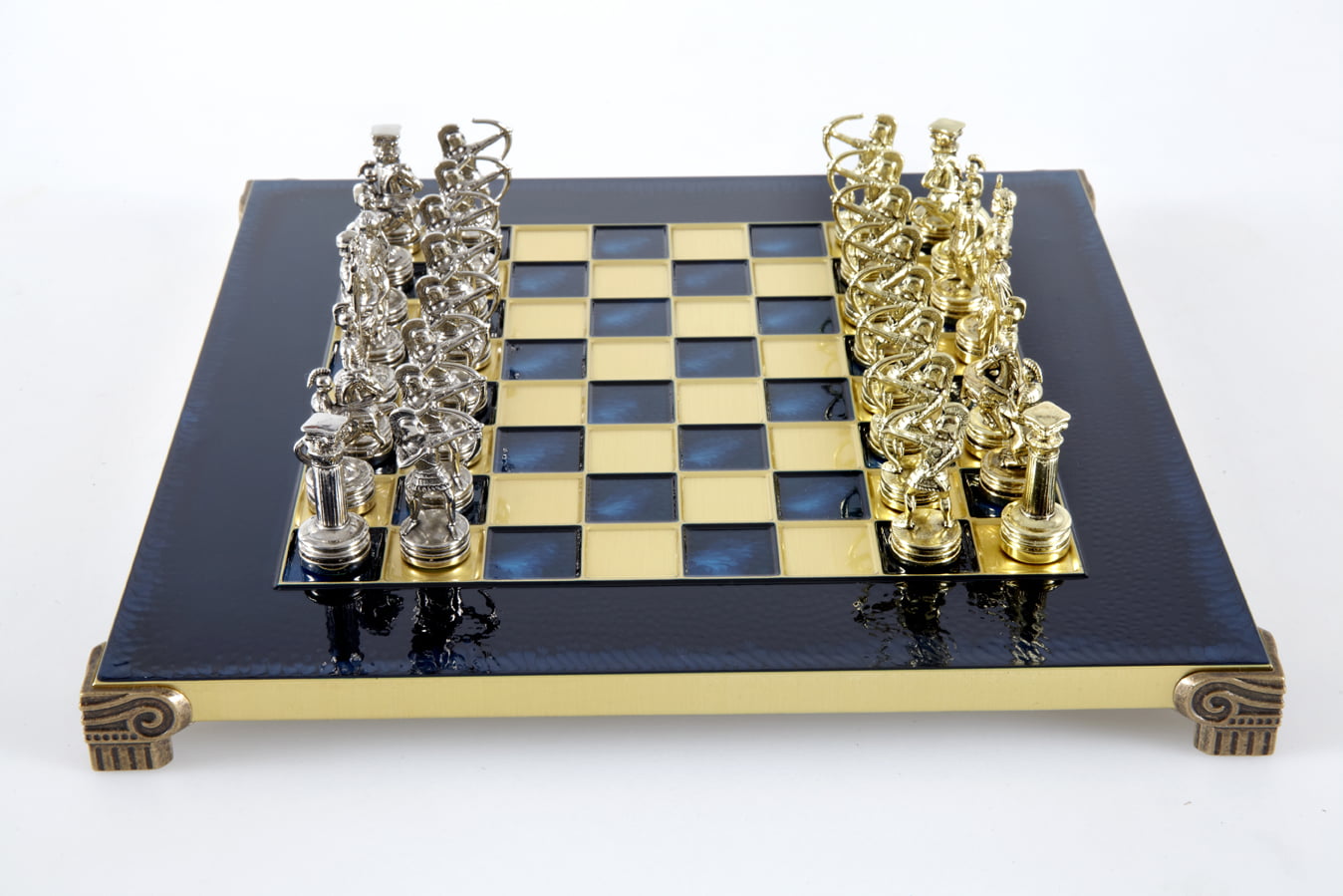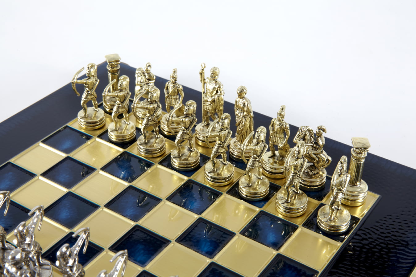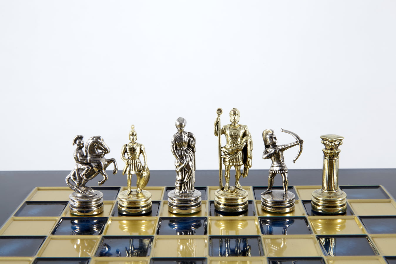 Pequeño Conjunto de Juego de Ajedrez en Metal Plateado y Dorado Arqueros – Estuche de Madera Laminada con Tablero de Ajedrez de Metal