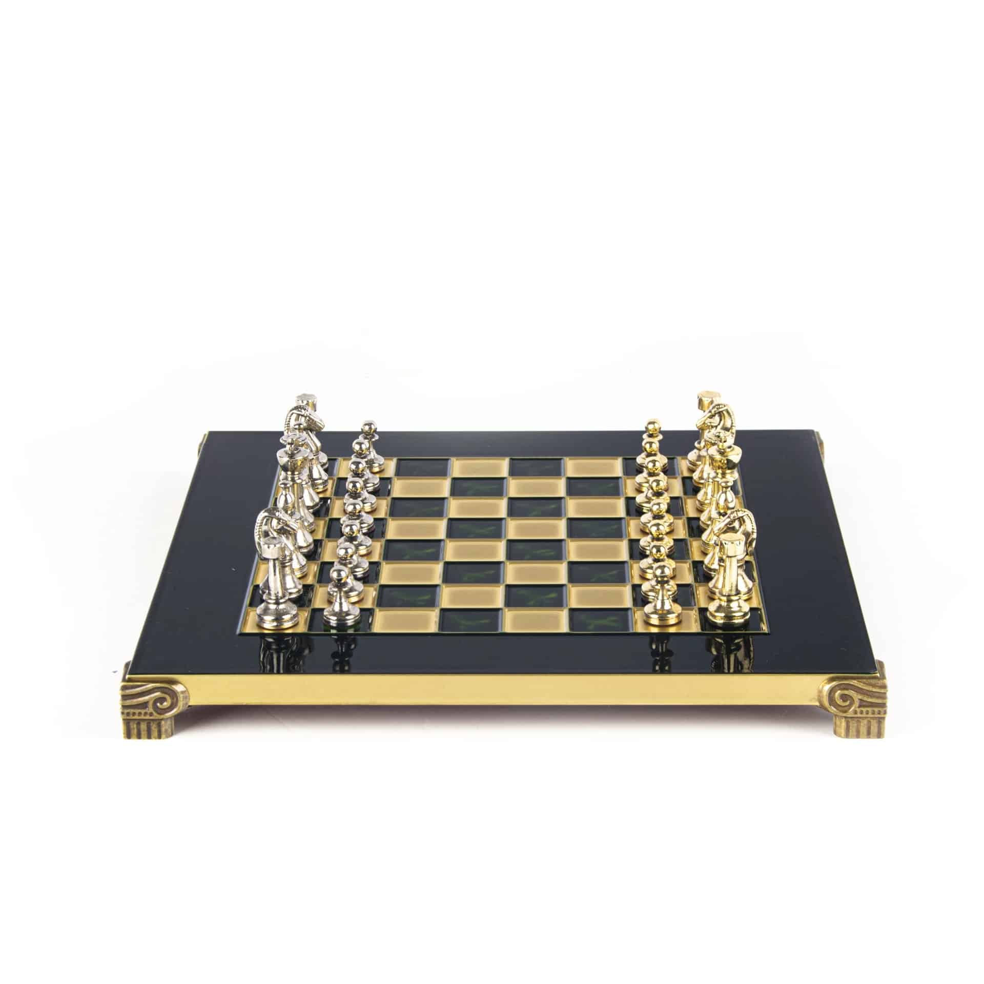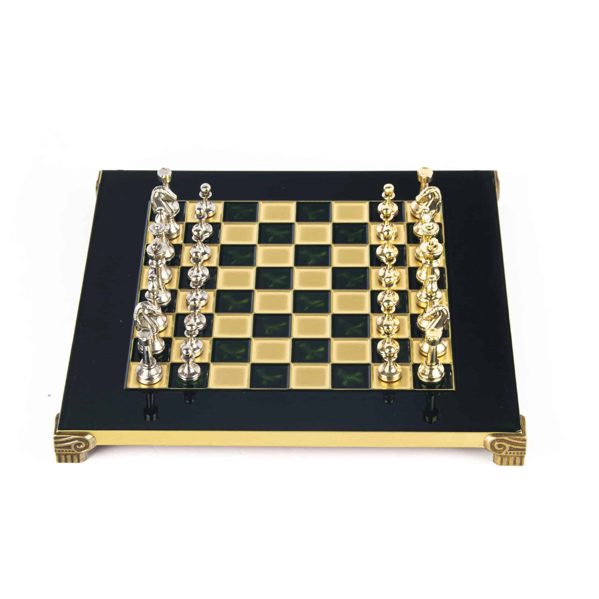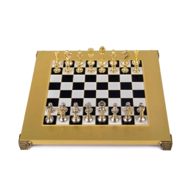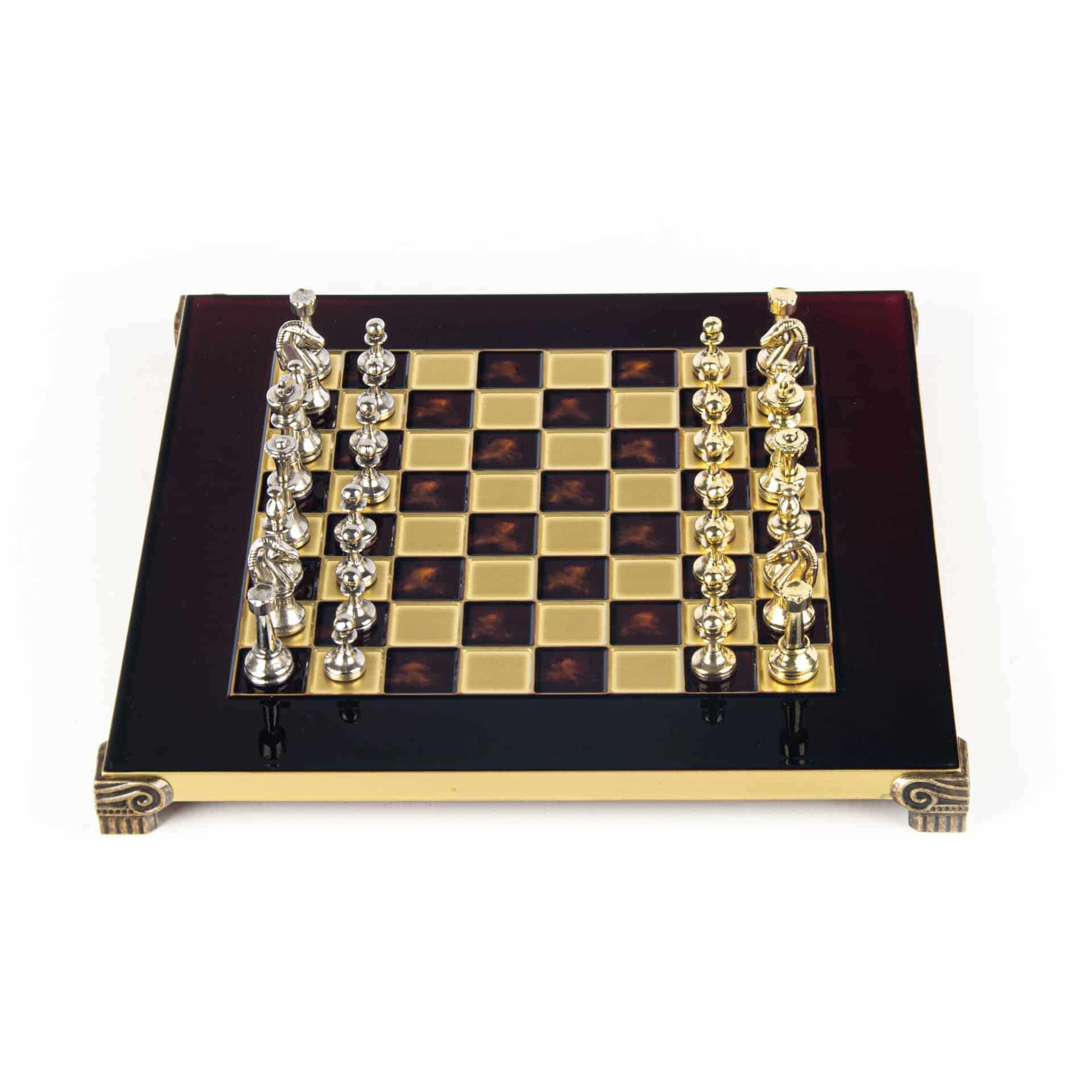 El tablero de ajedrez en pie, de dimensiones compactas de 28 x 28 cm, está fabricado en metal robusto, garantizando una durabilidad a toda prueba mientras ofrece un diseño moderno y sofisticado. El tablero se distingue por sus líneas limpias y su acabado impecable, en armonía con las piezas de metal que se enfrentan en él.