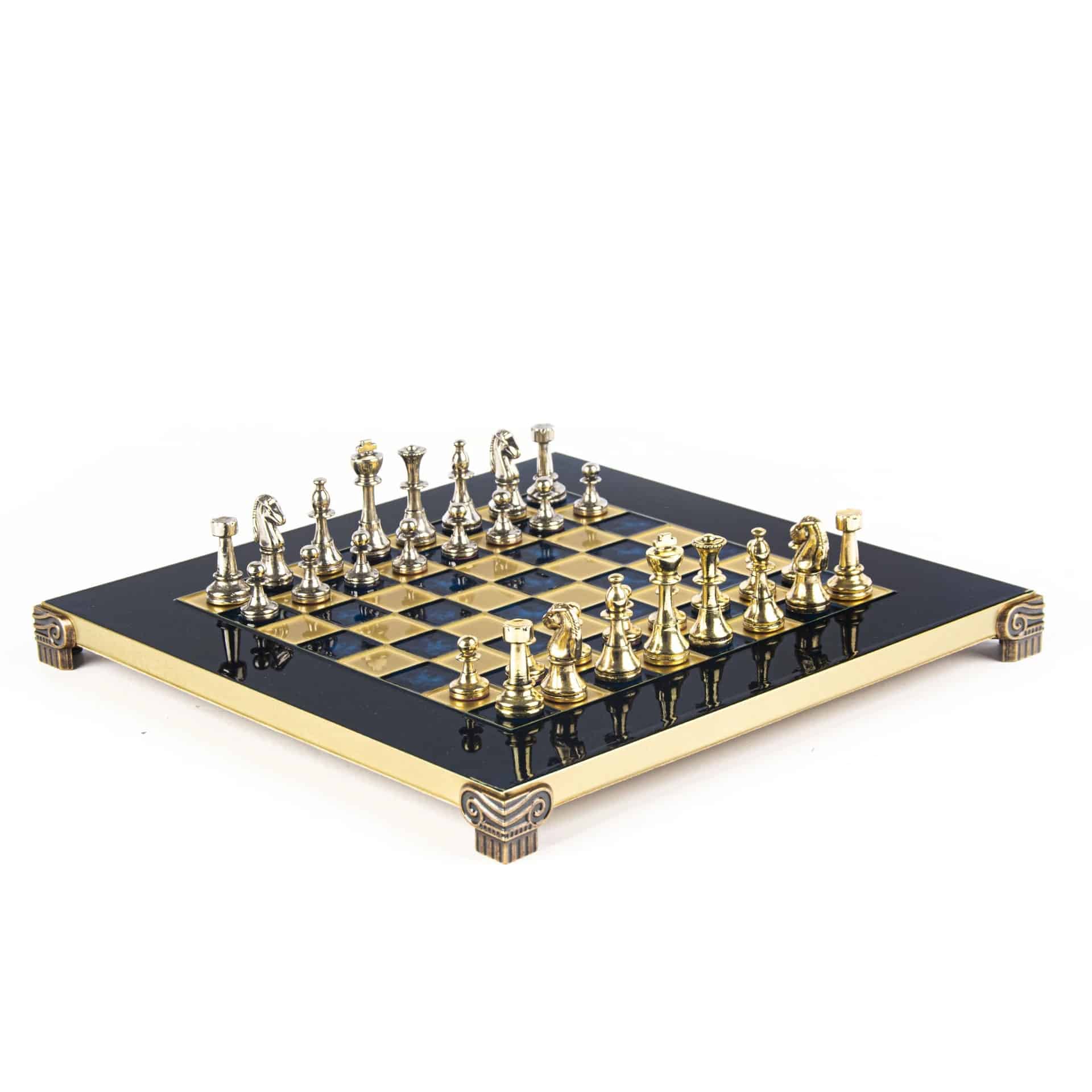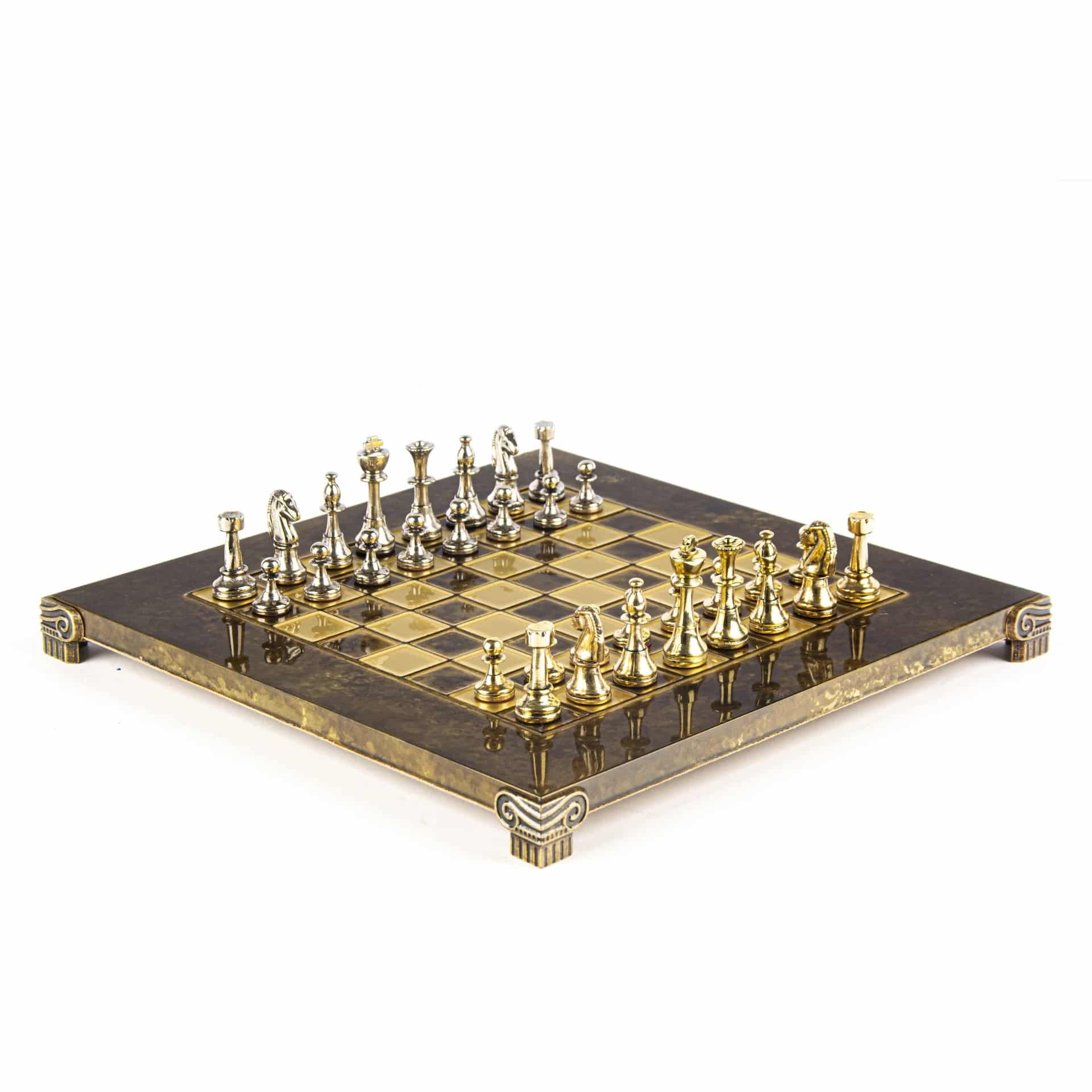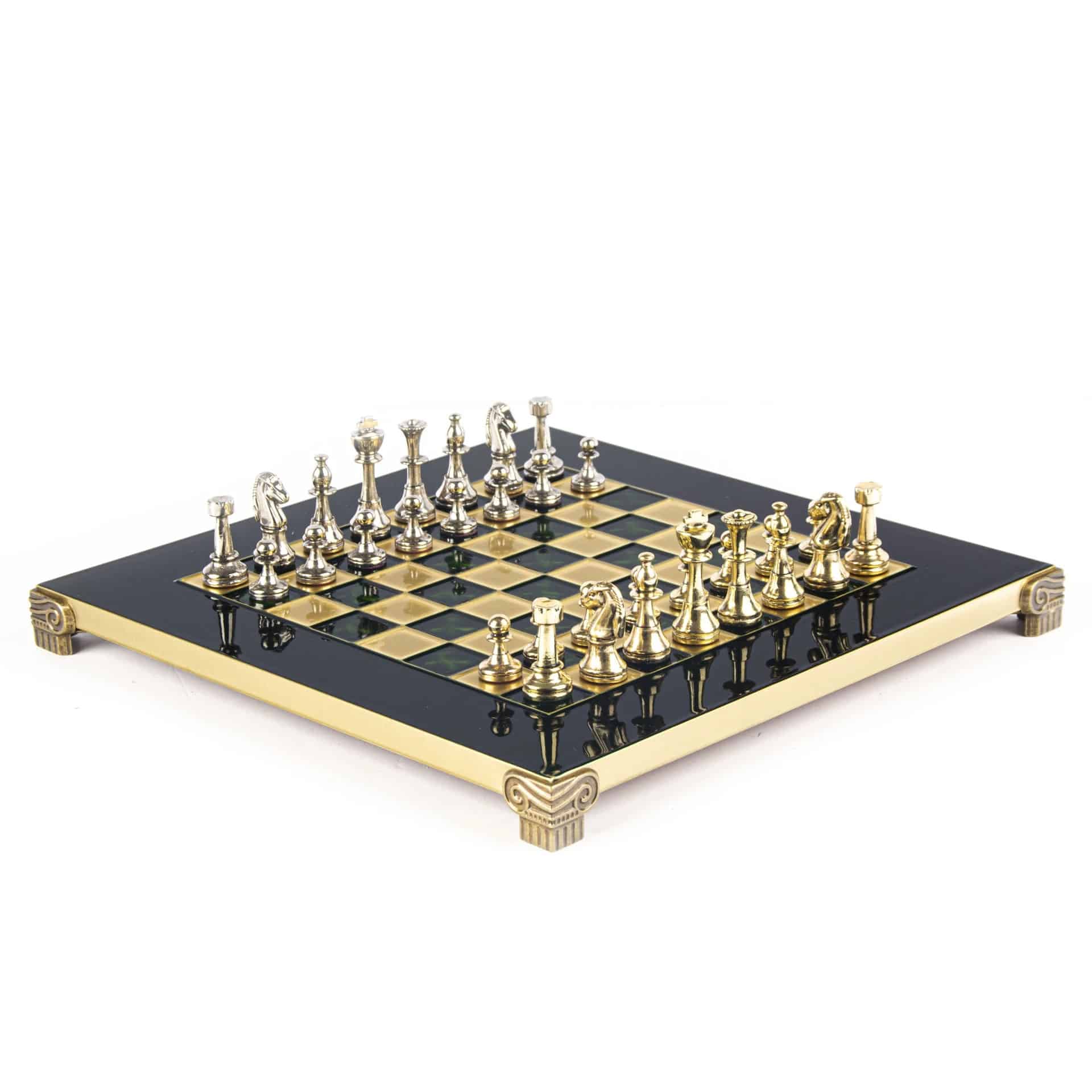 El tablero de ajedrez en pie, de dimensiones compactas de 28 x 28 cm, está fabricado en metal robusto, garantizando una durabilidad a toda prueba mientras ofrece un diseño moderno y sofisticado. El tablero se distingue por sus líneas limpias y su acabado impecable, en armonía con las piezas de metal que se enfrentan en él.