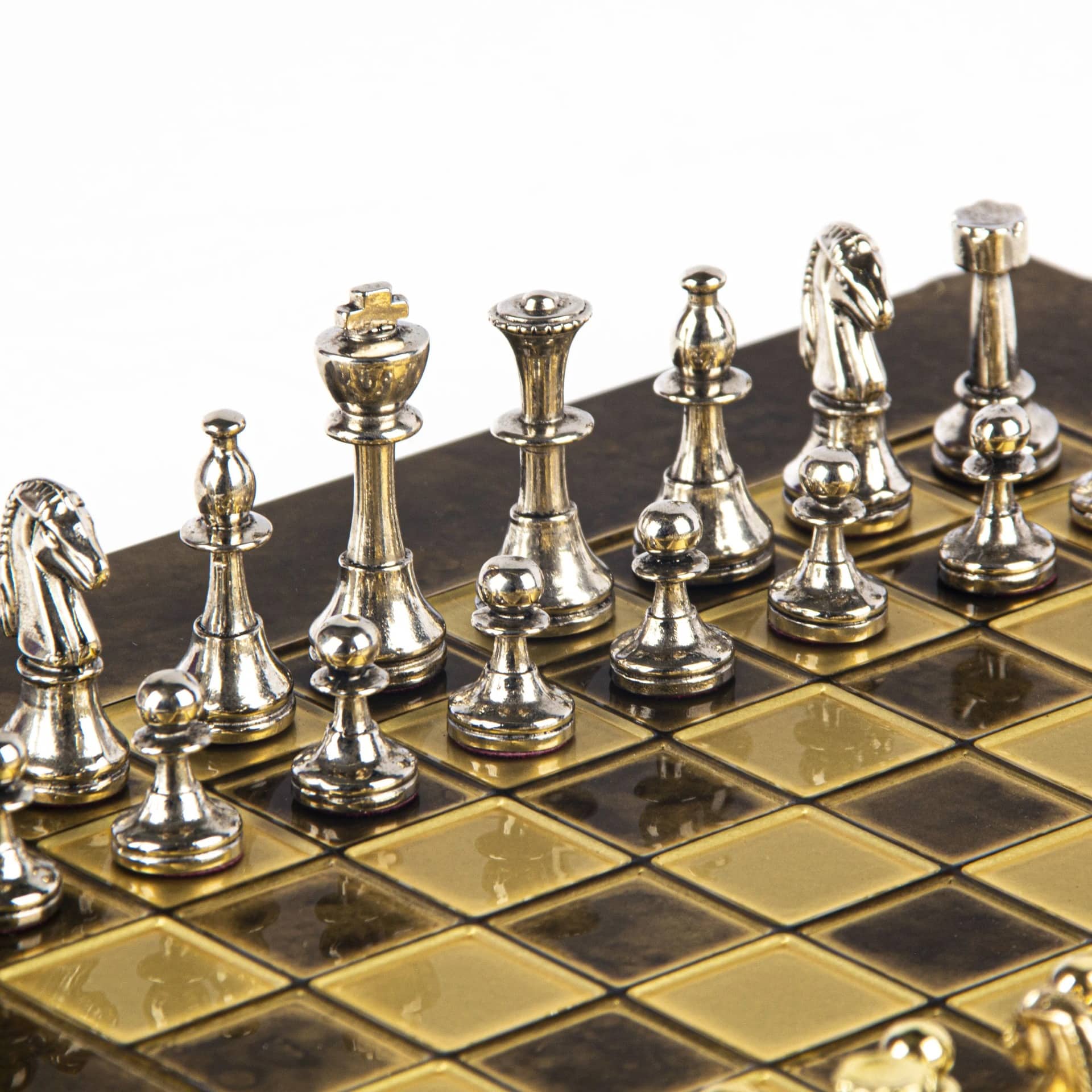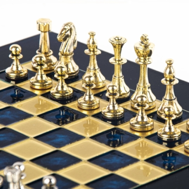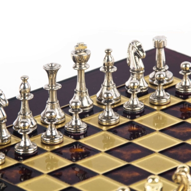 Pequeño Conjunto de Ajedrez Staunton en Metal Plateado y Dorado con Tablero de Ajedrez en Metal y Caja de Almacenamiento